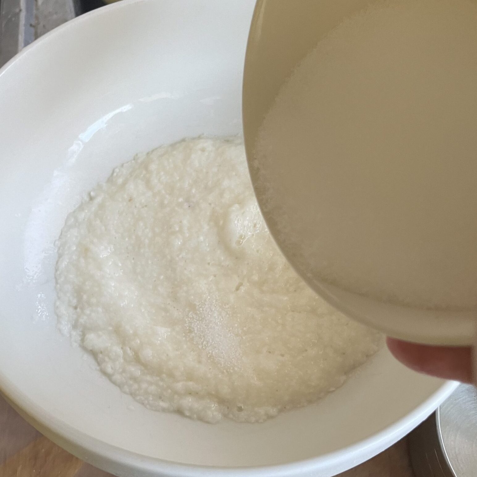 ボウルにすりおろした山芋を入れ、砂糖を3回に分けて加えその都度すりこぎでよく混ぜる。