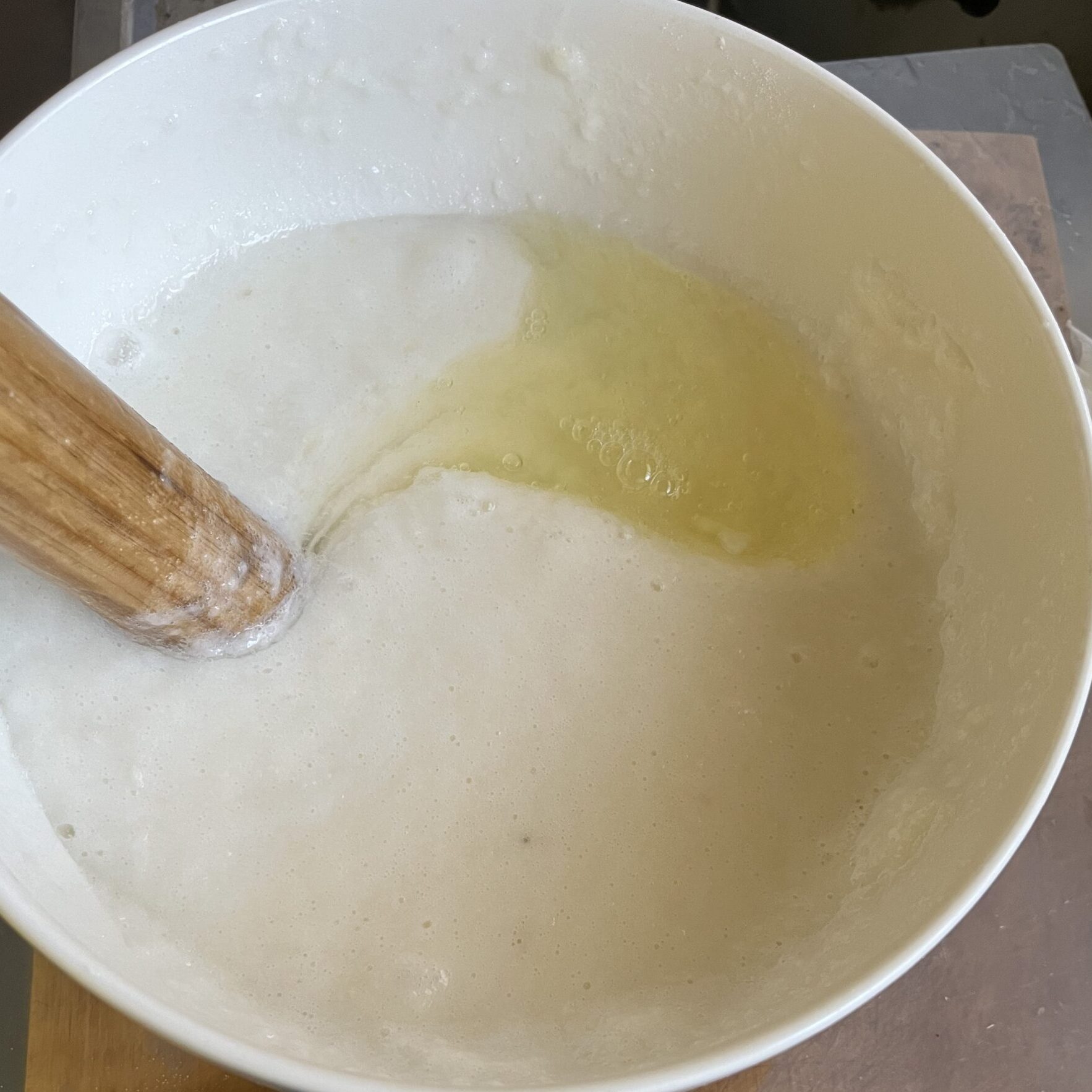 - 上新粉、水、卵白もそれぞれ3回に分けて加え、混ぜる。