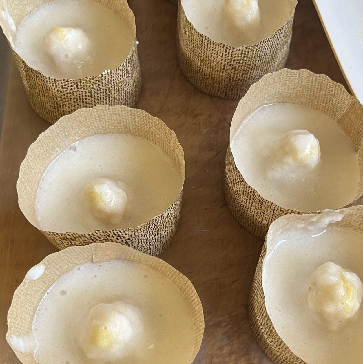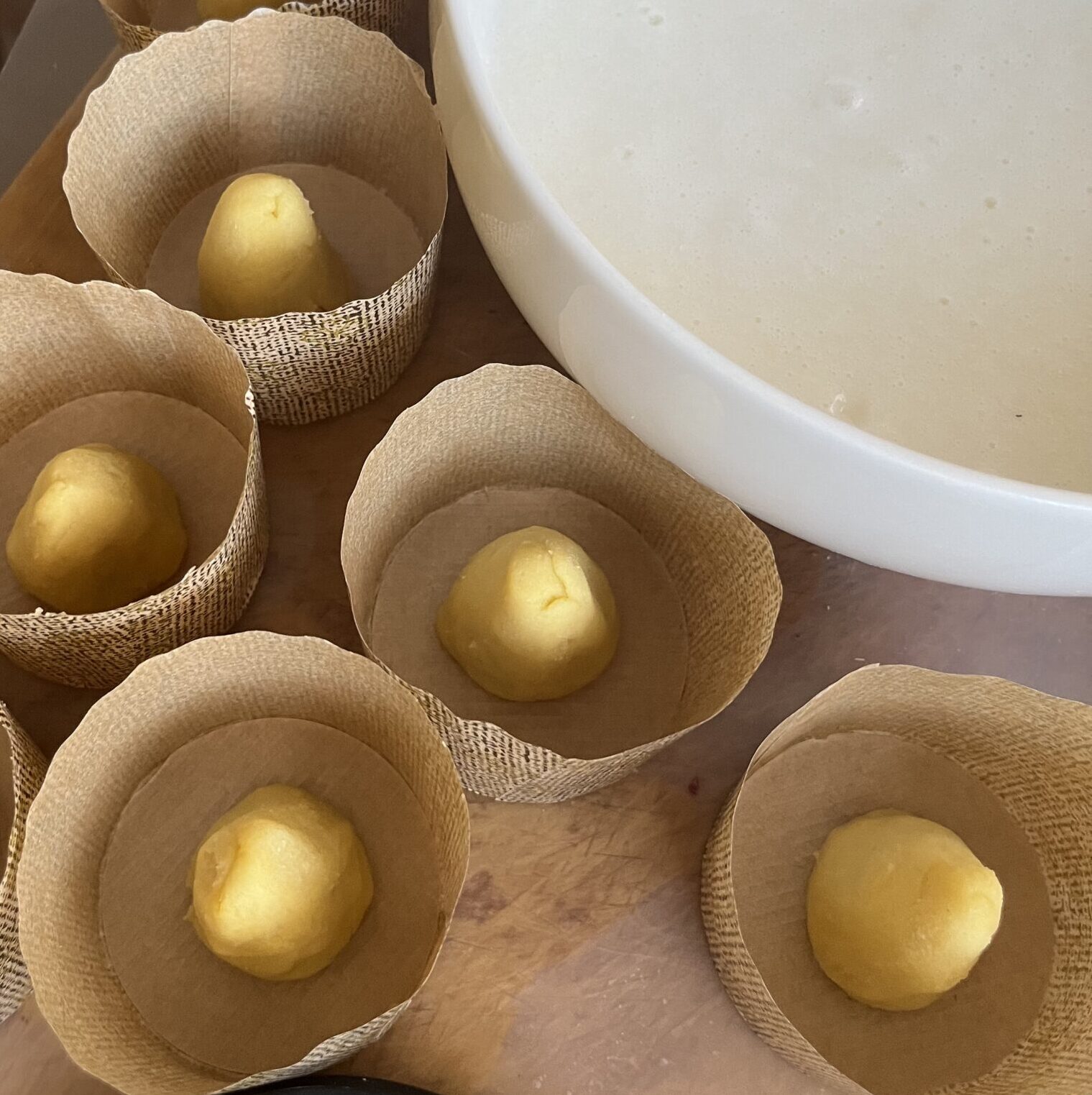 - マフィンカップの中央にさつまいも餡を置き、その上からかるかん生地を入れていく。