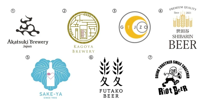 ①暁ブルワリー/②籠屋/③後藤醸造/④世田谷しばりん農園/⑤発酵ビストロSAKEYA-KITAMI/⑥ふたこビール/⑦RIOT BEER