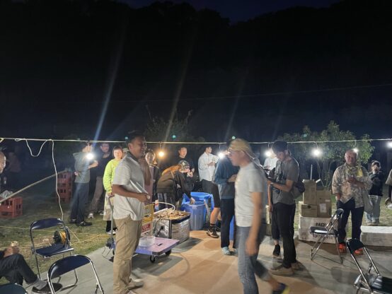 お祭りが無事終わった夜。波止場では慰労会が開催された。公民館で島の人たちが用意してくれた料理や、周囲の島から取り寄せてくれたオードブル(六島には居酒屋やお店がない)が電球の灯りで照らし出される。