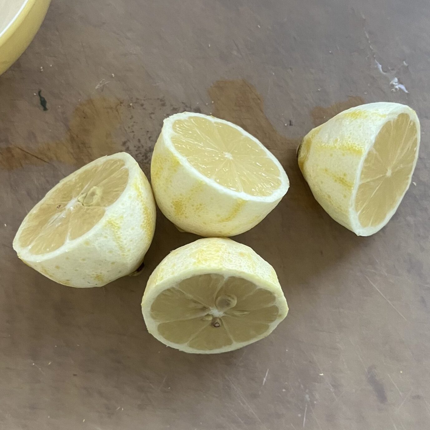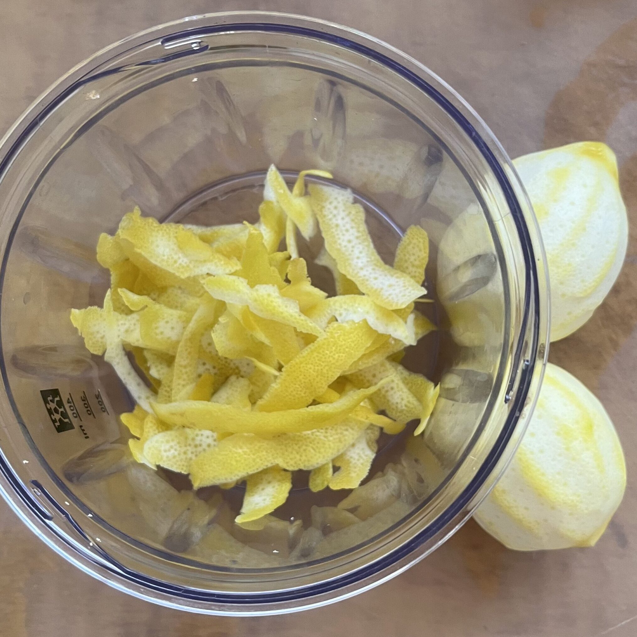 - レモンを塩水でよく洗い、皮をむいてすりおろすか細かく刻む。