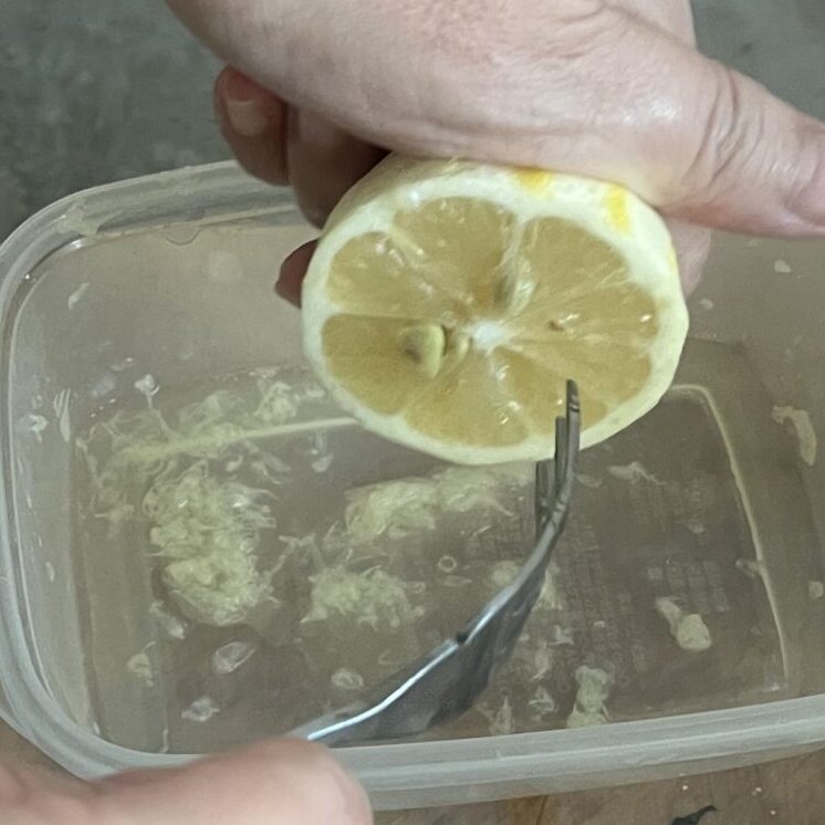 - レモンは半分に切り、断面にフォークを刺して果汁を搾る。