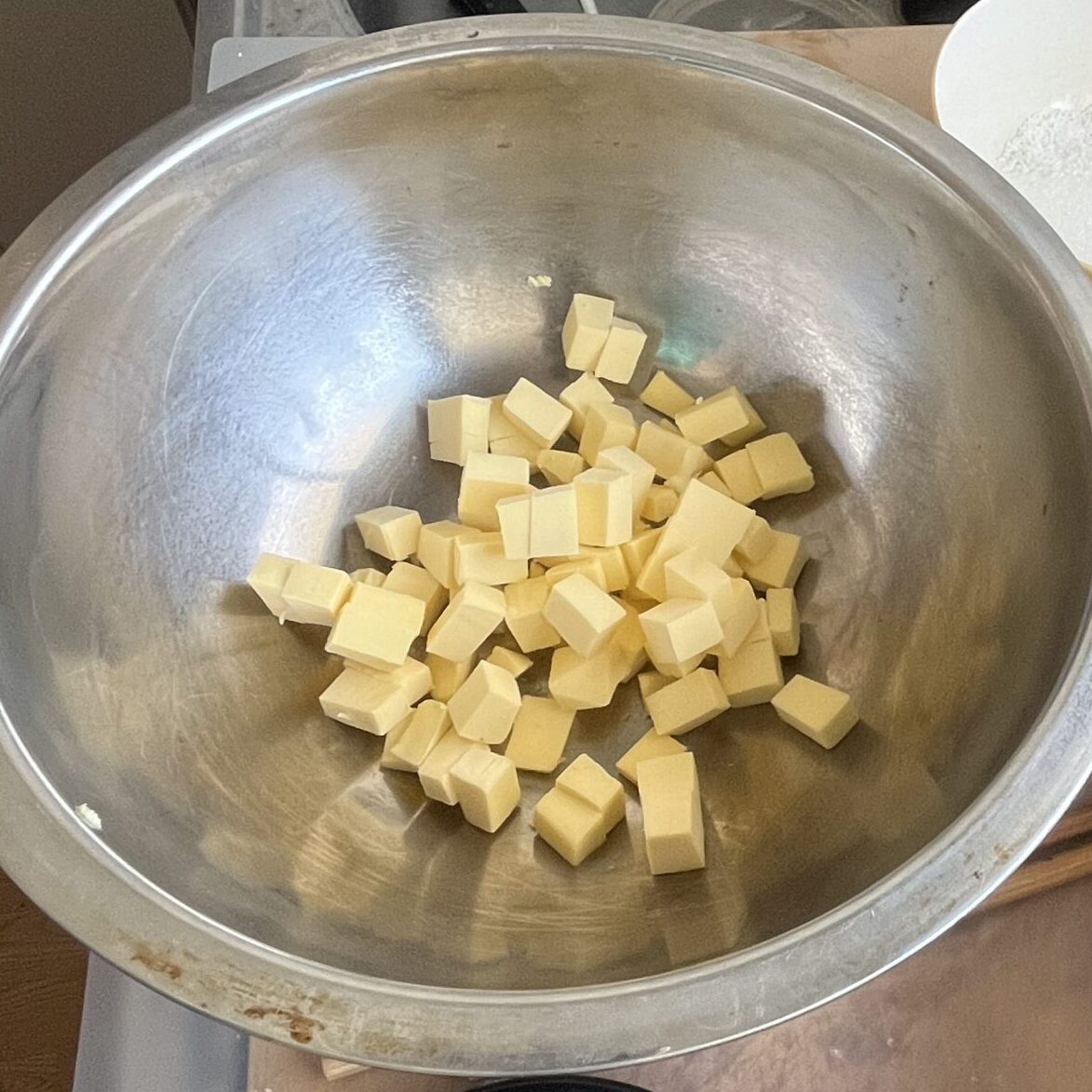 - バターは2cm角に切り、ボウルに入れる。卵は卵黄と卵白に分け、卵白は冷蔵庫に入れておく。