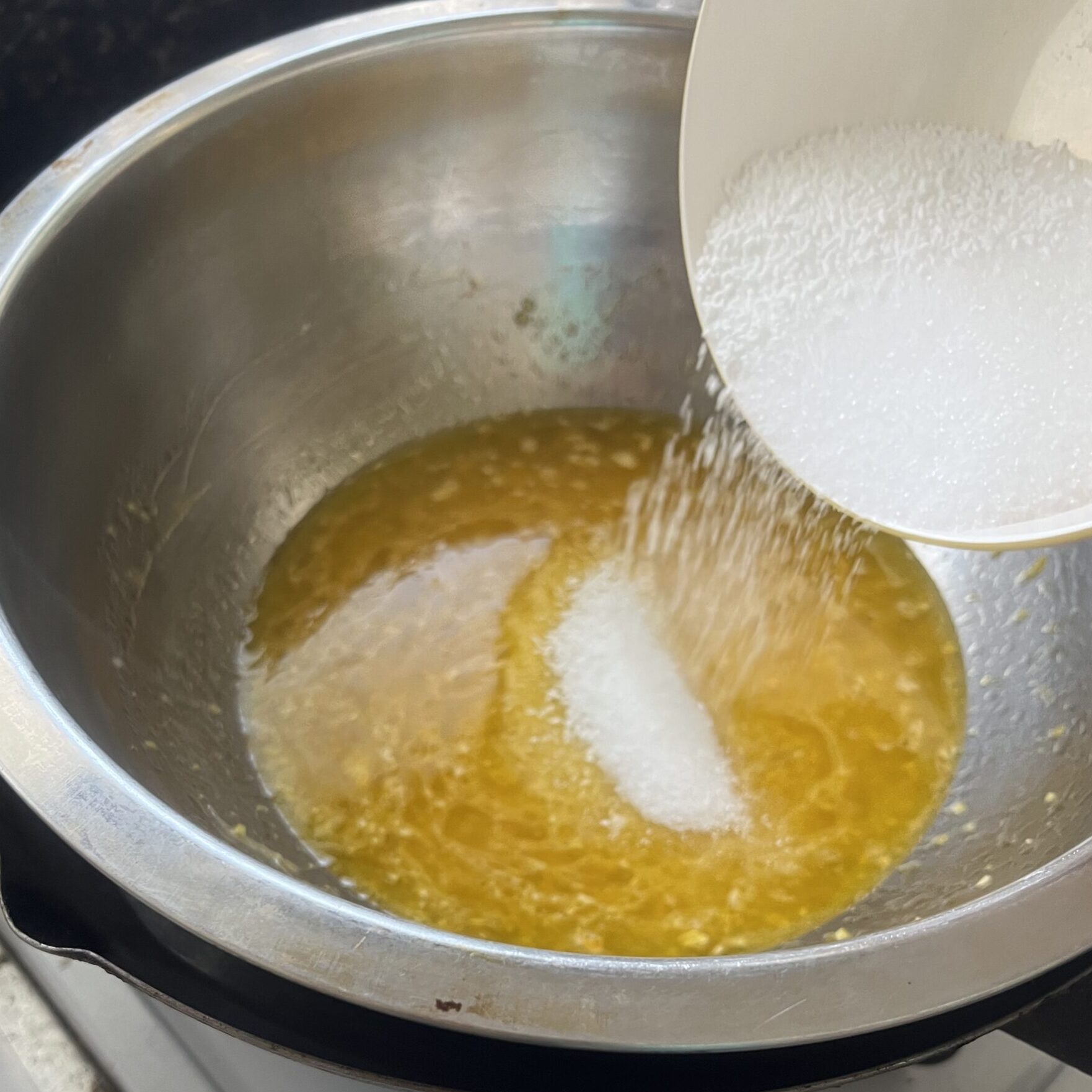 - 湯煎のままゴムべらでよく混ぜながらレモン汁、レモンの皮を加えていく。