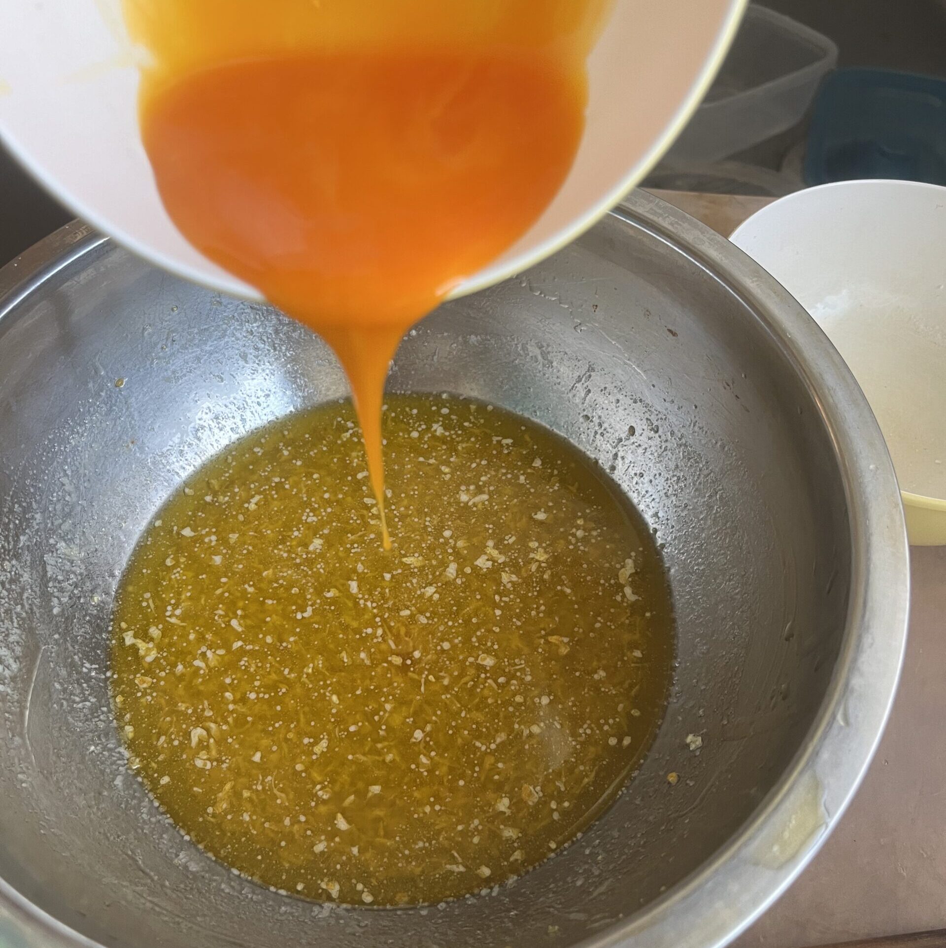 - 湯煎から外し、溶いた卵黄を少しづつ加えていく。ここで熱の入り方が偏ったり、混ぜ方が足りなかったりすると滑らかにならないので注意。