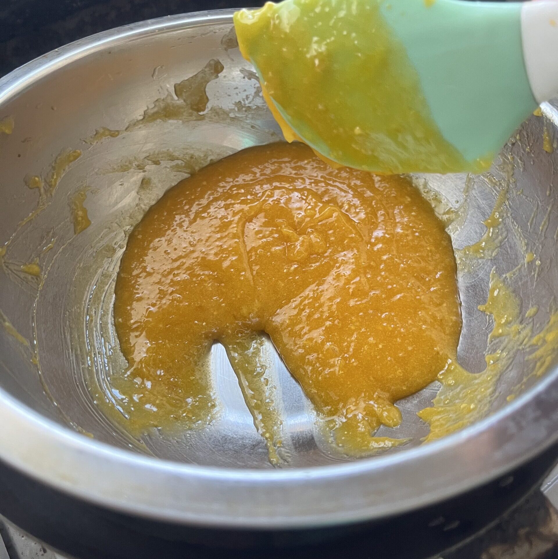 - 湯煎から外し、ボウルの余熱を感じなくなるまでかき混ぜる。粗熱が取れるとさらに粘度が増す。