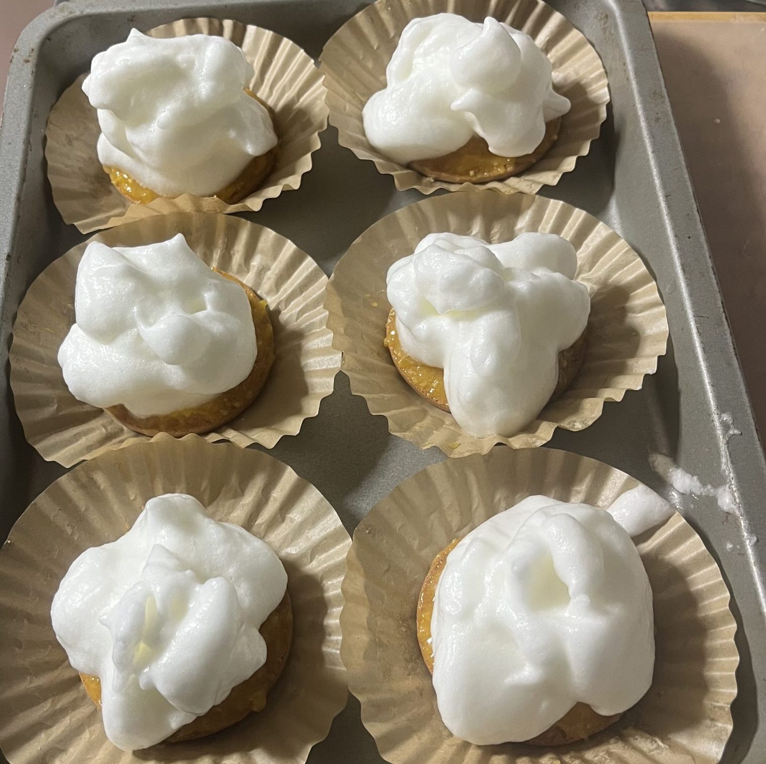 レモンカードをパイ生地に乗せてメレンゲをかぶせて焼き目をつければレモンメレンゲパイですが、もっとお手軽に市販のビスケットにレモンカードとメレンゲを乗せて焼いてみました。