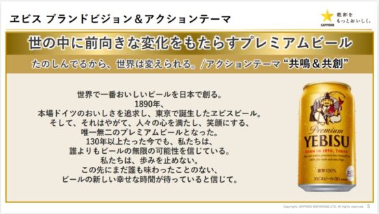 ヱビスのブランドビジョンは「世の中に前向きな変化をもたらすプレミアムビール」。