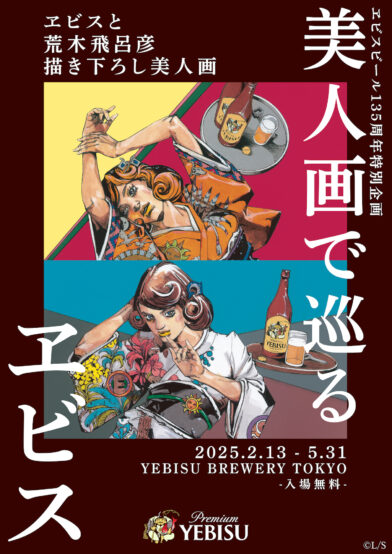 明治時代より展開されていたヱビスビールの美人画ポスターを、漫画家 荒木飛呂彦氏が現代的にアップデート、ヱビスビールデザイン缶や、YEBISU BREWERY TOKYO 特別イベント(特別展示・オリジナルグッズ販売)などで、目にすることができます。