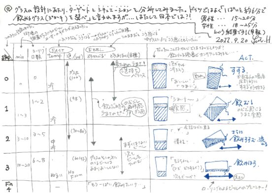 ビール一杯を飲み切るまでの飲用シミュレーションと、「ショット」の設計図。(本人提供)