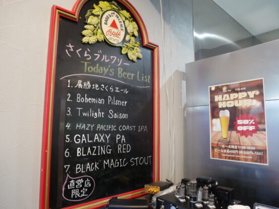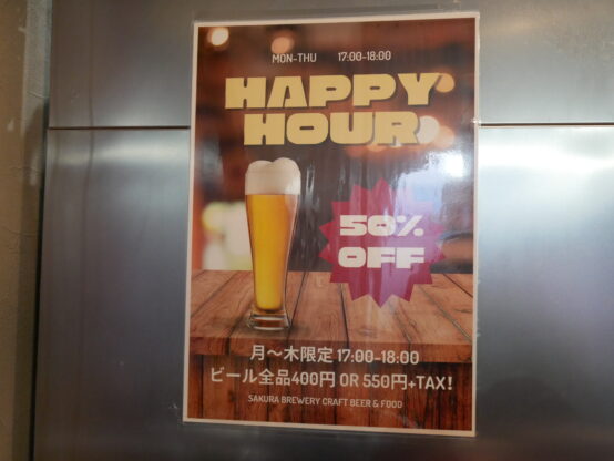 この日17時の開店直後を狙って訪問したのには理由があります。月曜日から木曜日までの17時~18時はハッピーアワー。ハッピーアワーで100円、200円引きというのは見かけますが、Sakura Brewery Craft Beer & Foodのハッピーアワーはビールがすべて半額!800円のビールが400円、1100円のビールなら550円(税別)で飲むことができます。