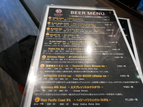 この日つながっていたビールは7種類。メニューには11種類のビールが並んでいて、その中からその日提供されるものには番号が振られています。1杯のお値段は800円のものが9種類、1,100円のものが2種類でした。