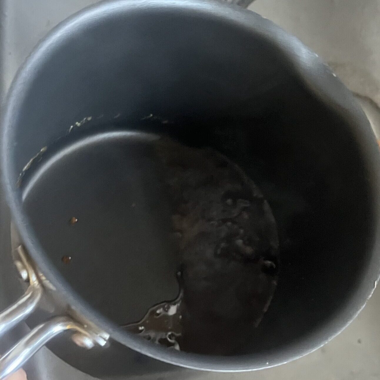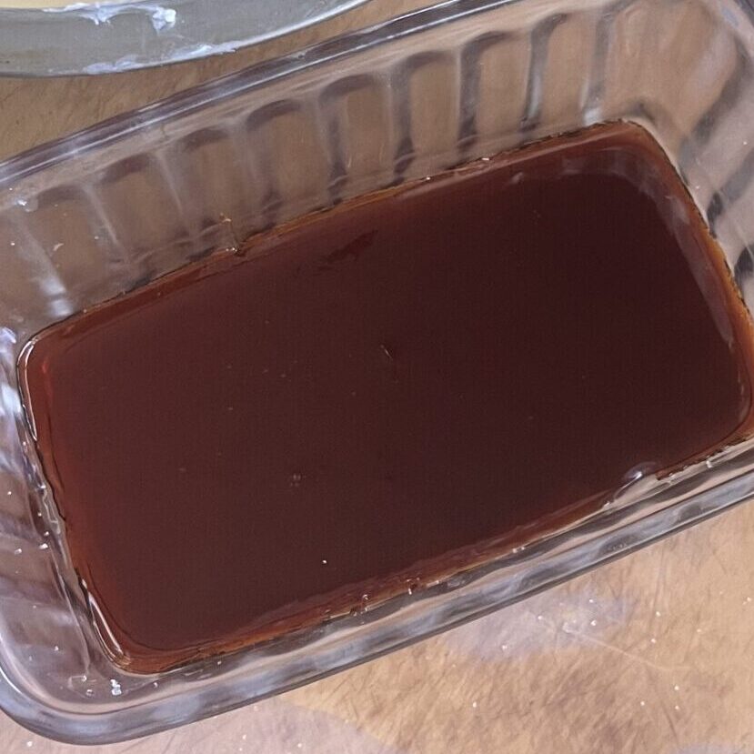 - 十分色づいたら、お湯を加えてカラメルをゆるめる。水分を加えるとはねることがあるので、流しの上で行うとよい。くれぐれも火傷に注意!