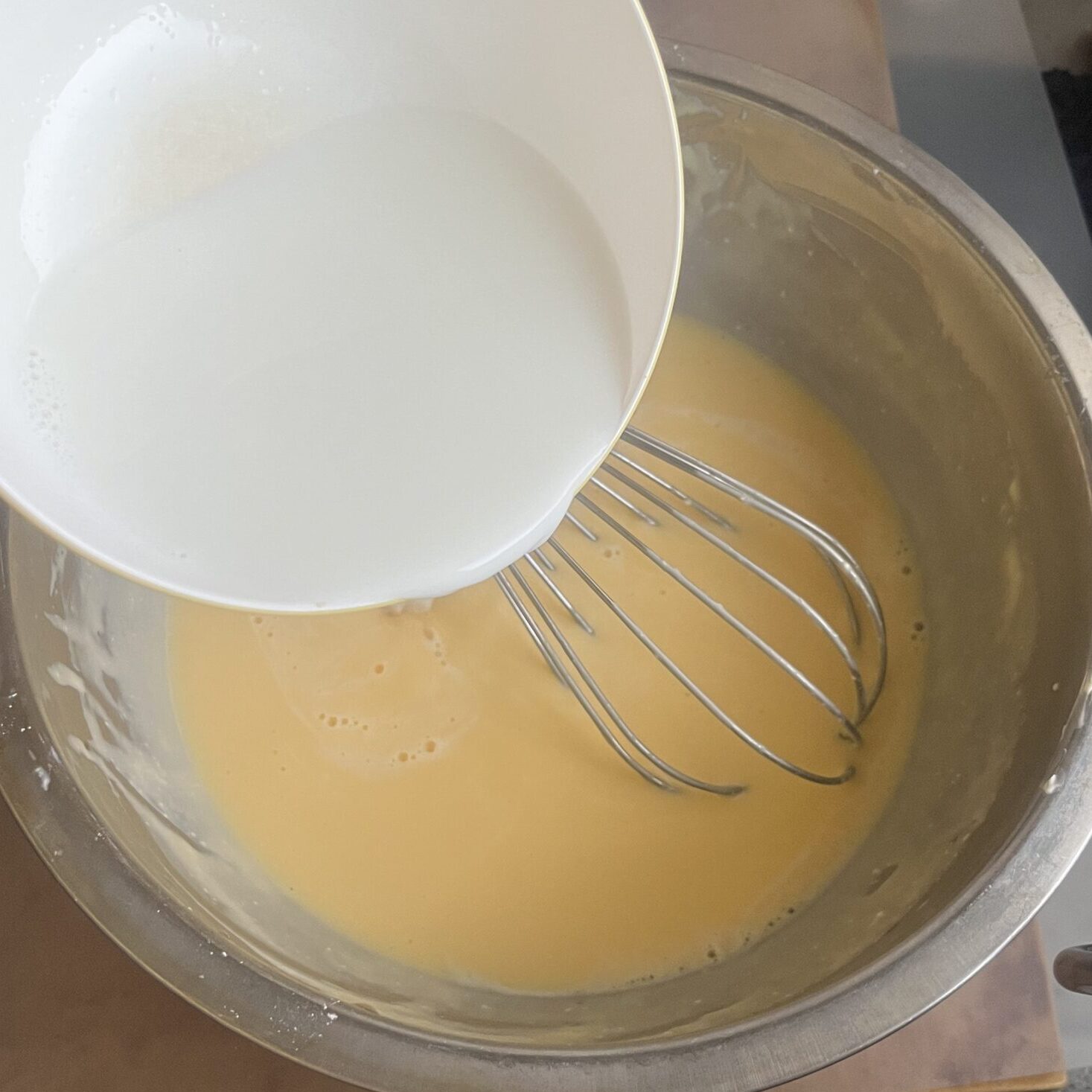 - 温めた牛乳を加え、さらに混ぜる。
