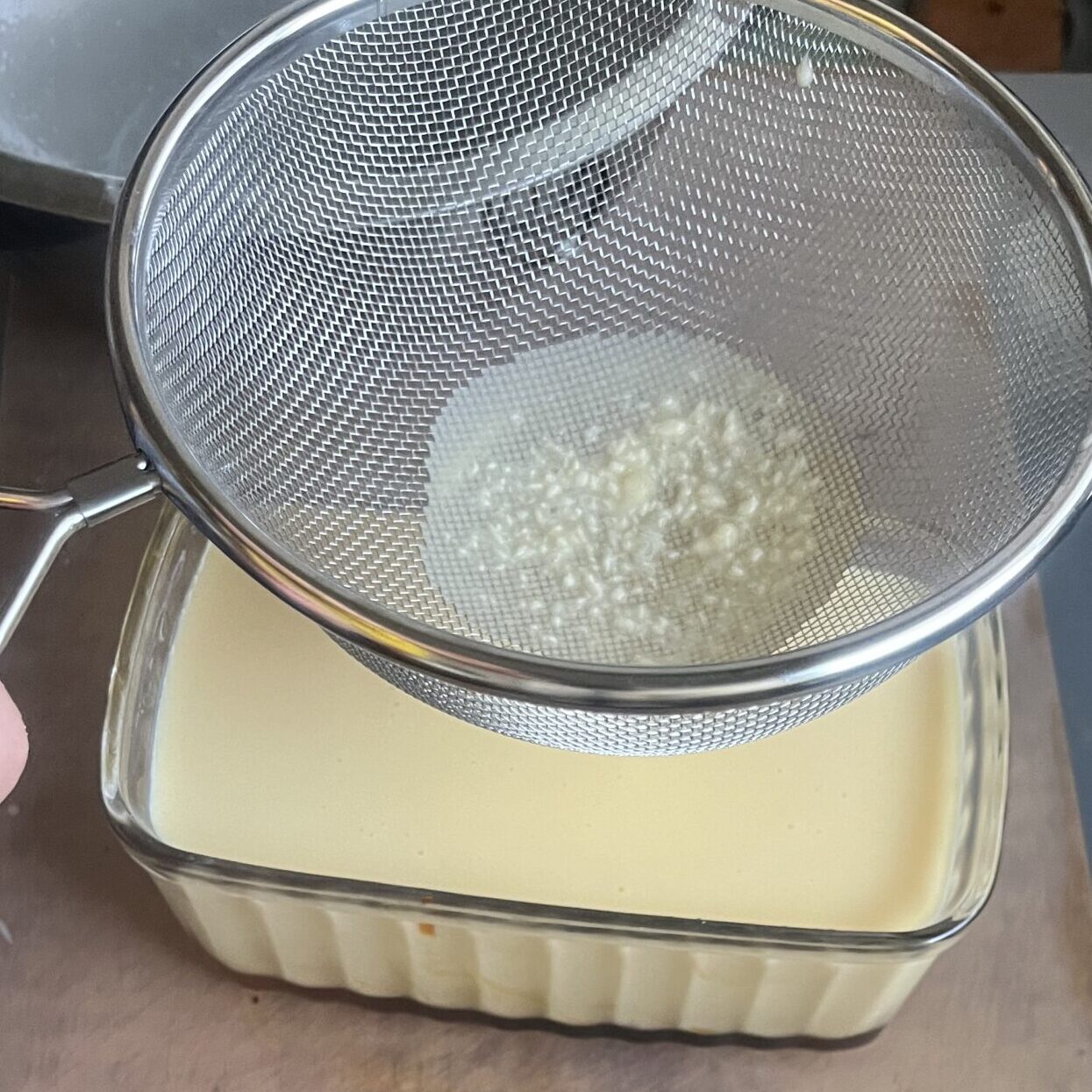 - 9の生地を、ざるでこしながら型に流す。