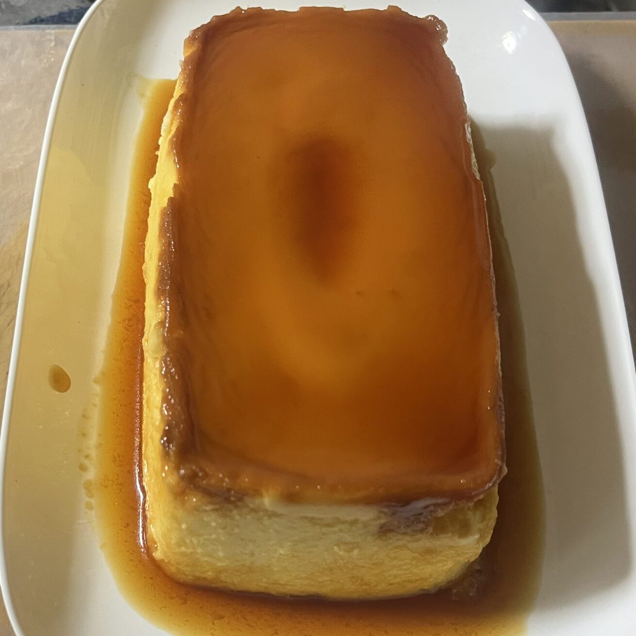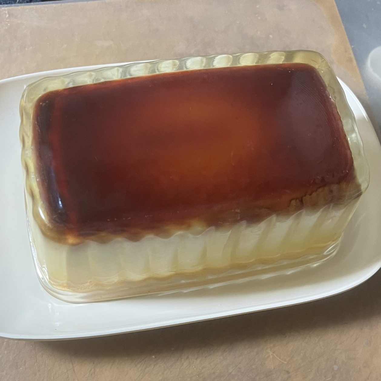 - 粗熱が取れたら、型の上に皿をかぶせ、ひっくり返して上下に軽く振りプリンを皿に開ける。