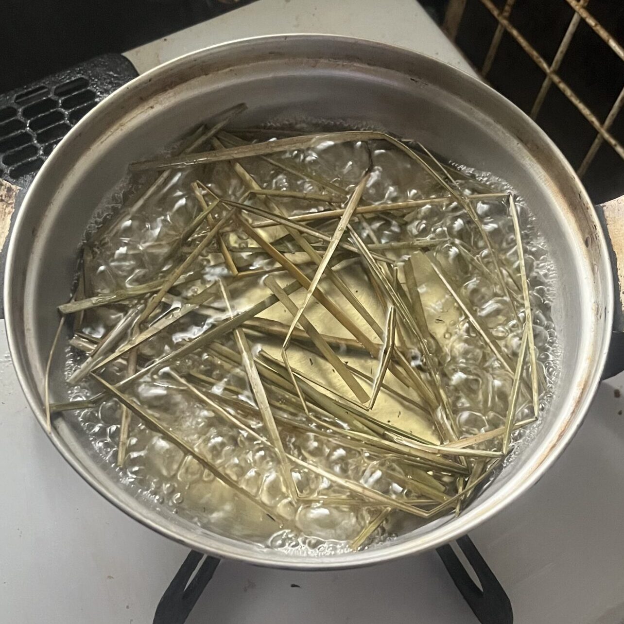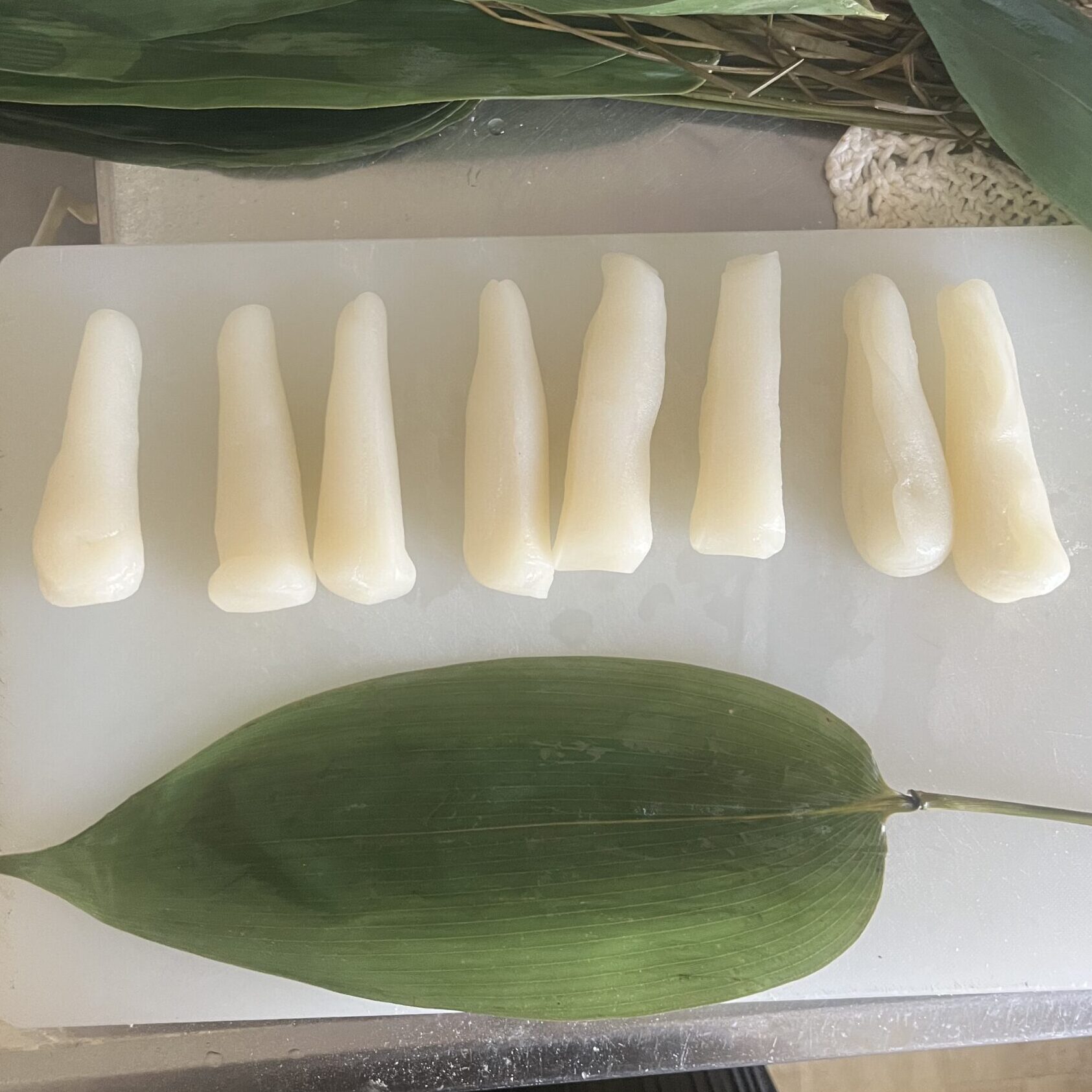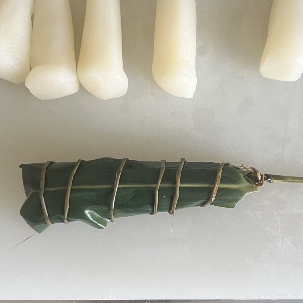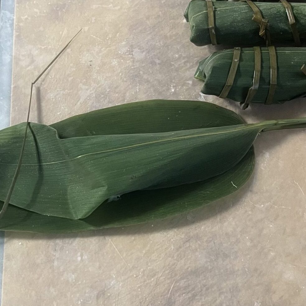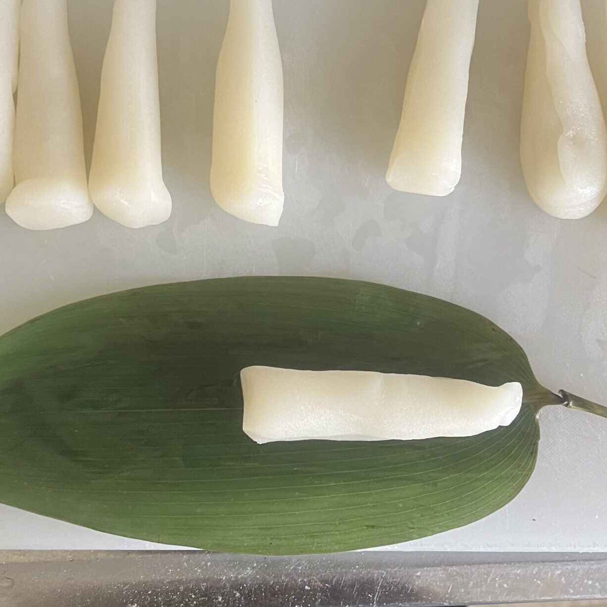 - 7の細い方を笹の葉の茎側になるようにのせ、もう1枚の笹の葉をかぶせる。