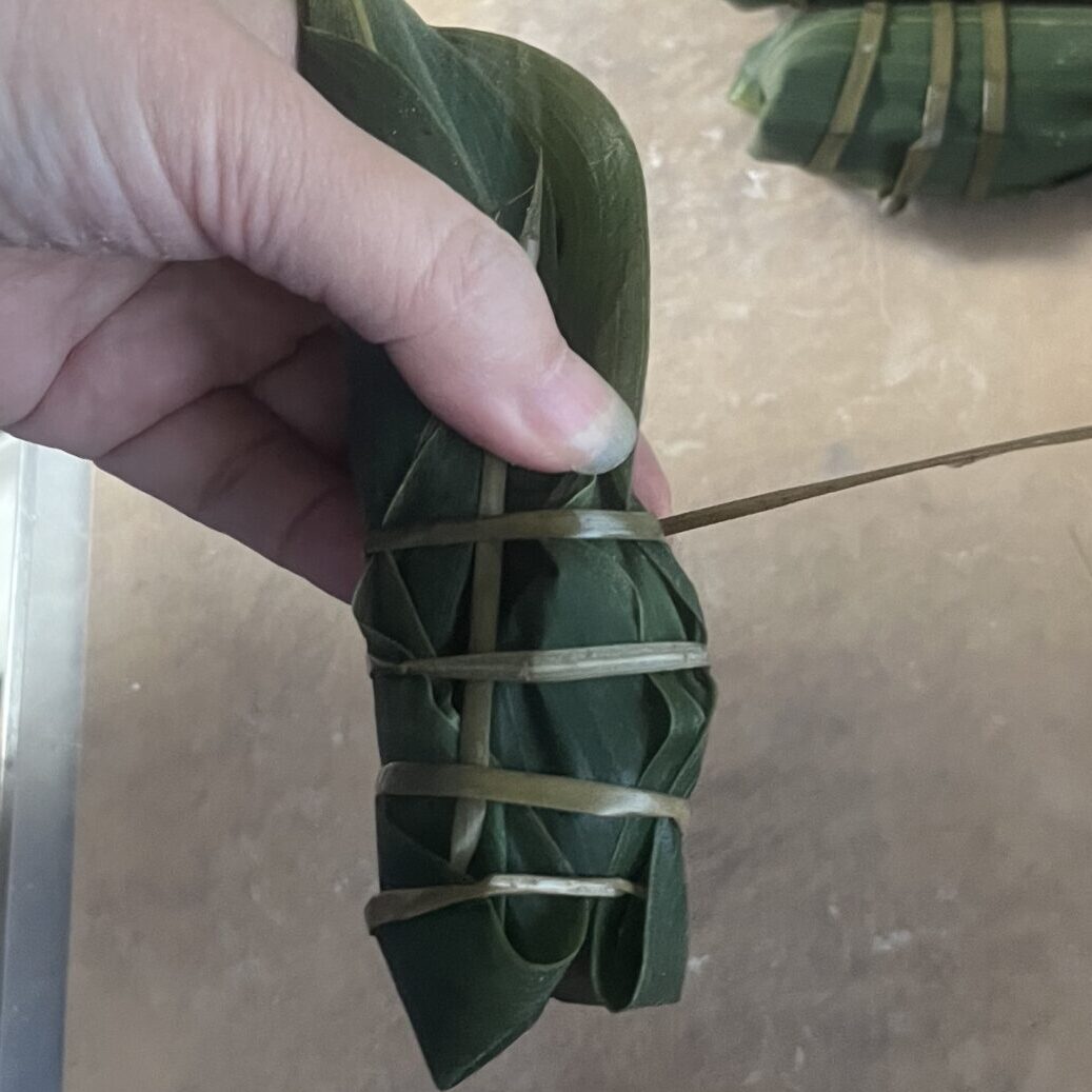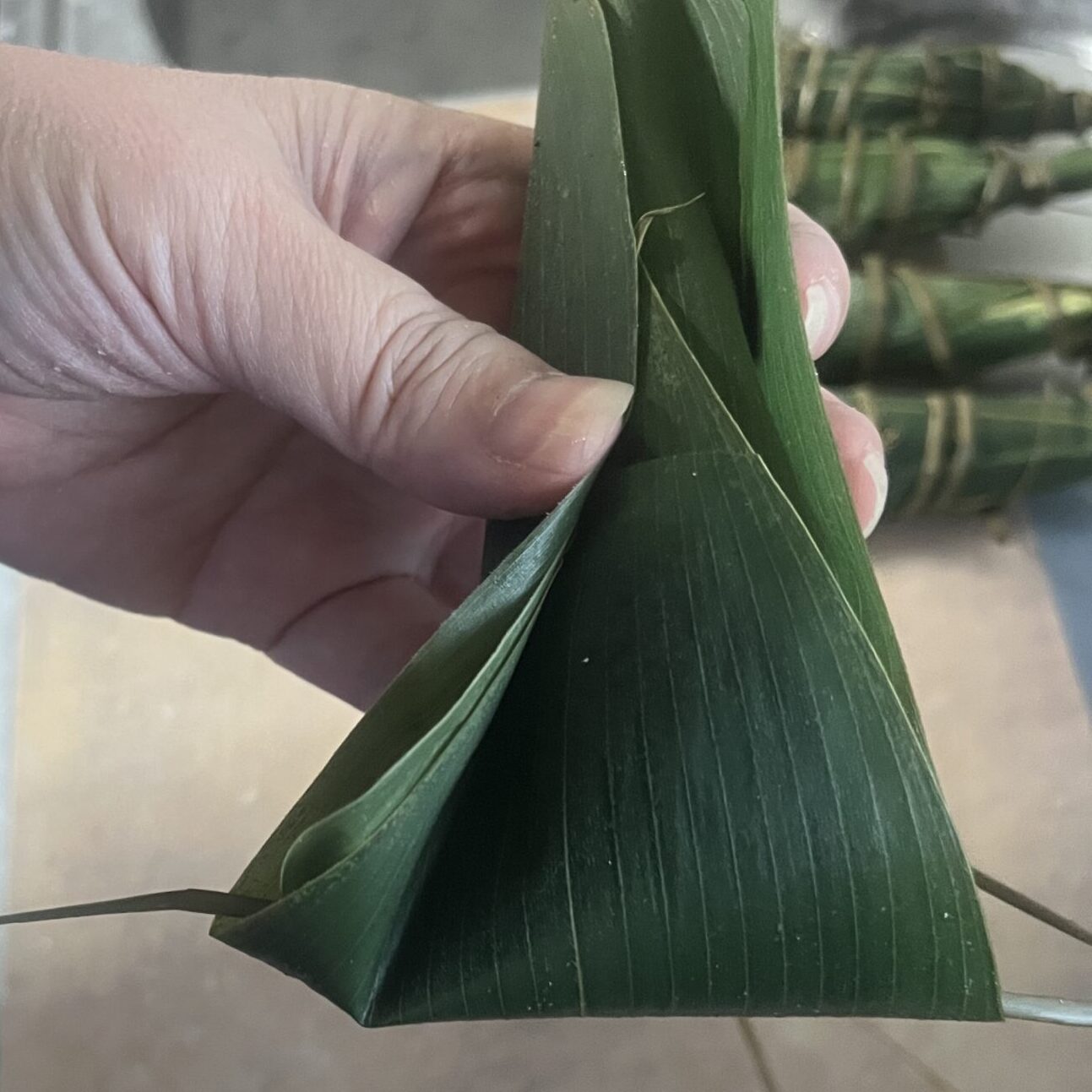 - 円錐形の下部にいぐさを当て、笹の葉を折り込み巻いていく。