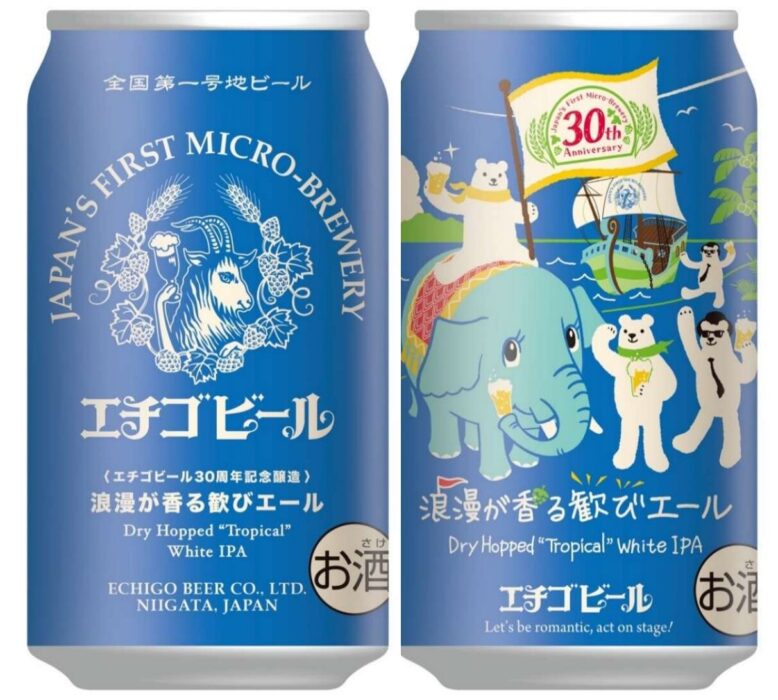パッケージのイラストでは、人気の定番商品「のんびりふんわり白ビール」や限定商品でお馴染みの白熊と、限定商品「華やぎホップのうきうきエール」などに登場したインド象が初めて共演!昨年販売した「前途洋々ホワイトエール」で白熊が乗っていた帆船が、インド象がくつろぐリゾート海岸に到着し、エチゴビール30周年を祝う乾杯をしています。一緒にお祝いしたくなりますね!