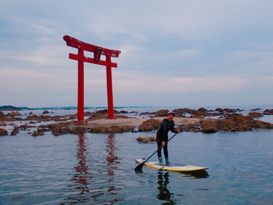 葉山の海辺にある森戸神社の沖合700メートルの岩礁にある赤鳥居に、SUPやカヌーで上陸。冒険心がくすぐられる。