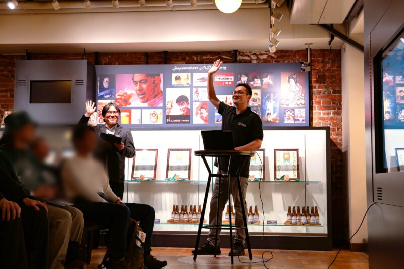「今年の”富良野ホップ”を語る会」として開催されたこのイベントは、セミナーの第1部と、実際にビールを味わう第2部との2部制で開催されました。会場は、札幌市内の札幌開拓使醸造所(札幌市中央区北2東4)。解説役は、サッポロビール北海道工場醸造部部長の八巻 勉氏です。