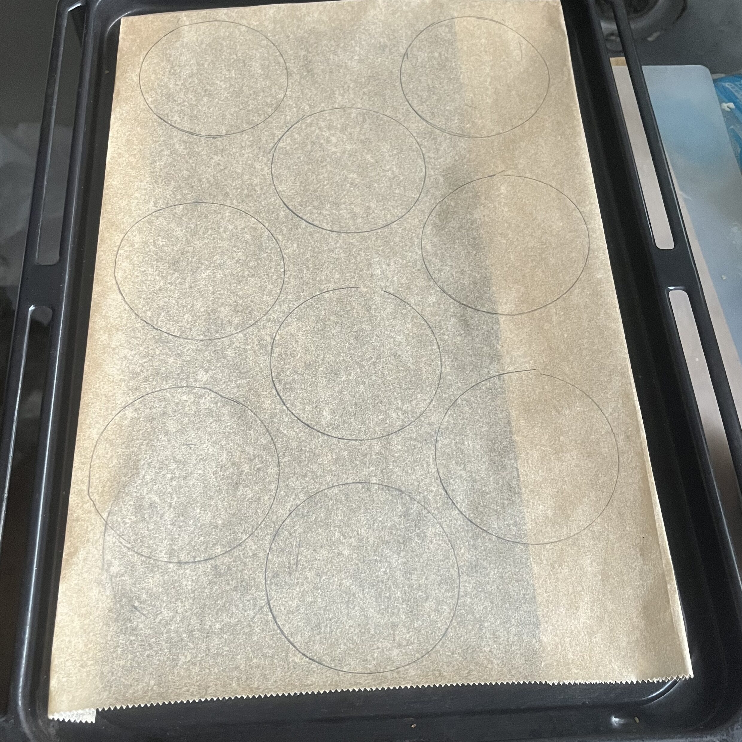 - ワックスペーパーをオーブン天板の大きさに切り、直径6cmの円を下書きしておく。