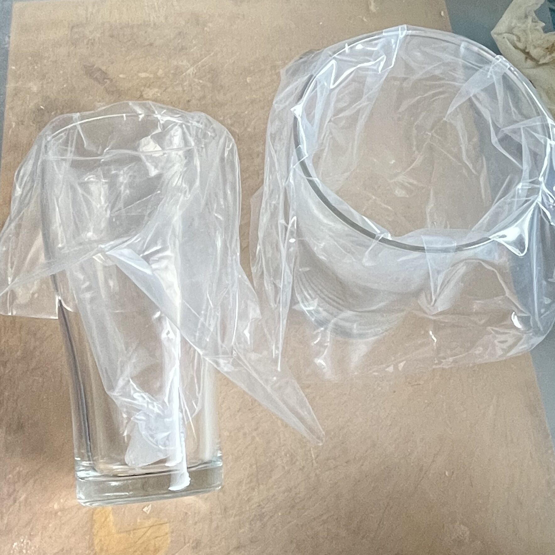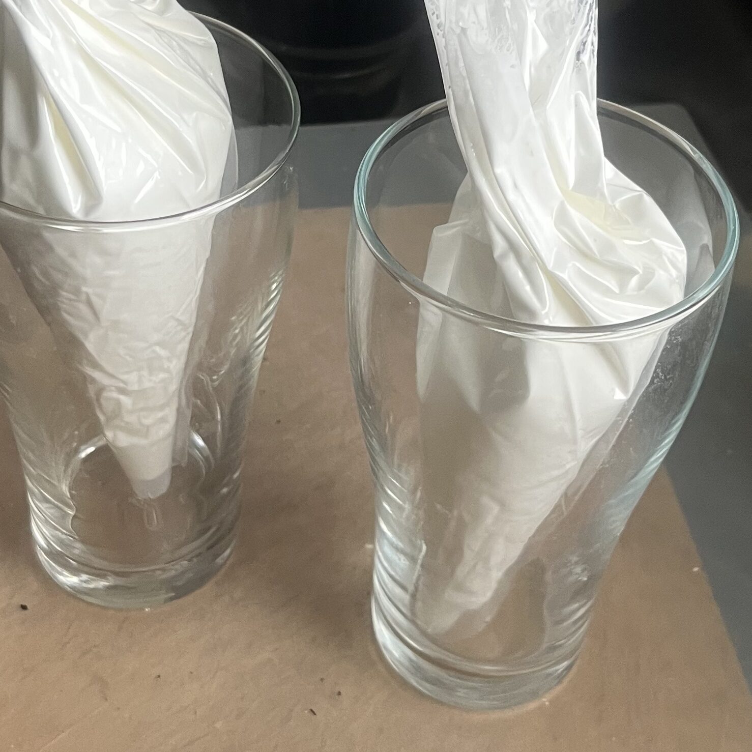 - クリーム絞り出し袋に口金をセットして、グラスにかぶせておく。2組準備する。