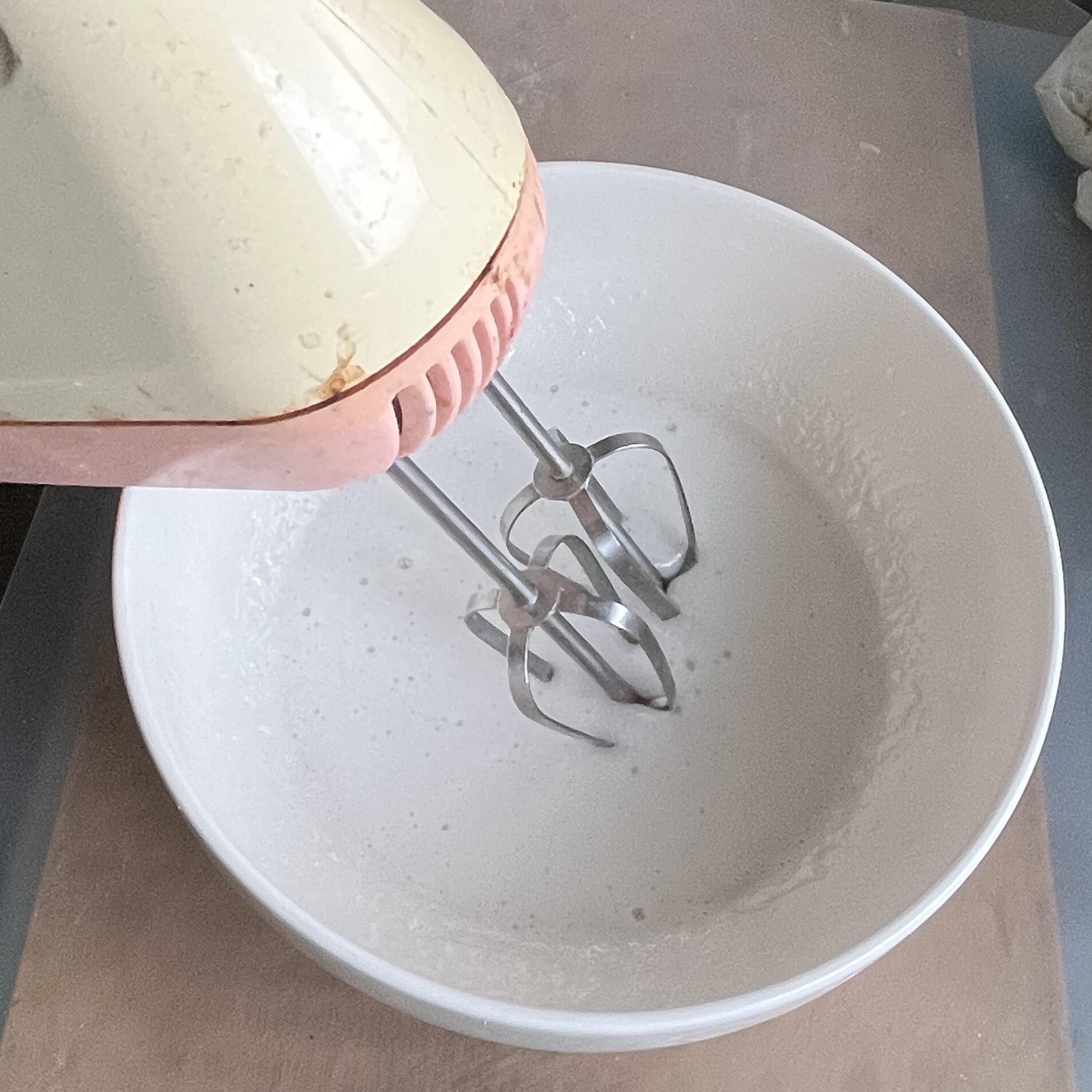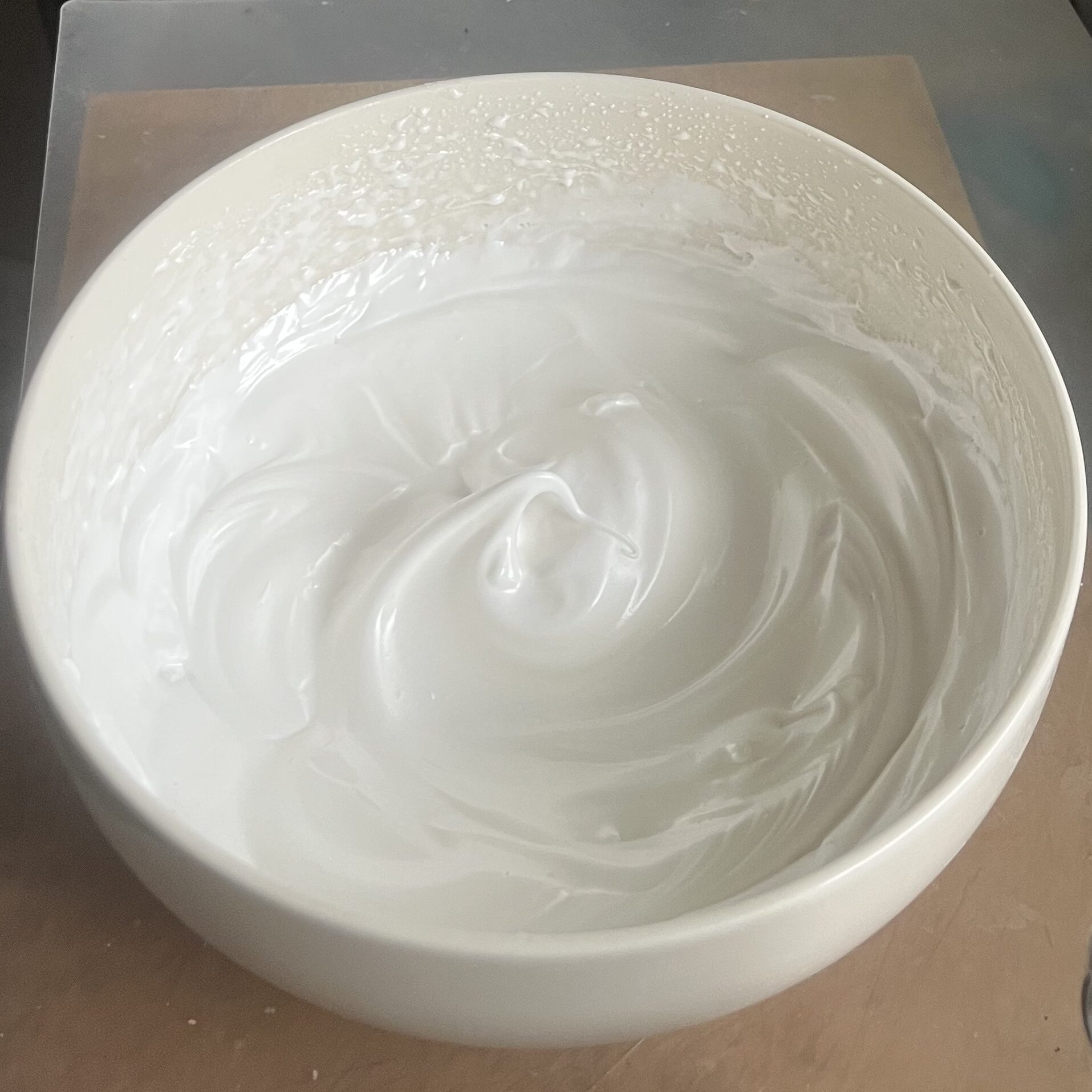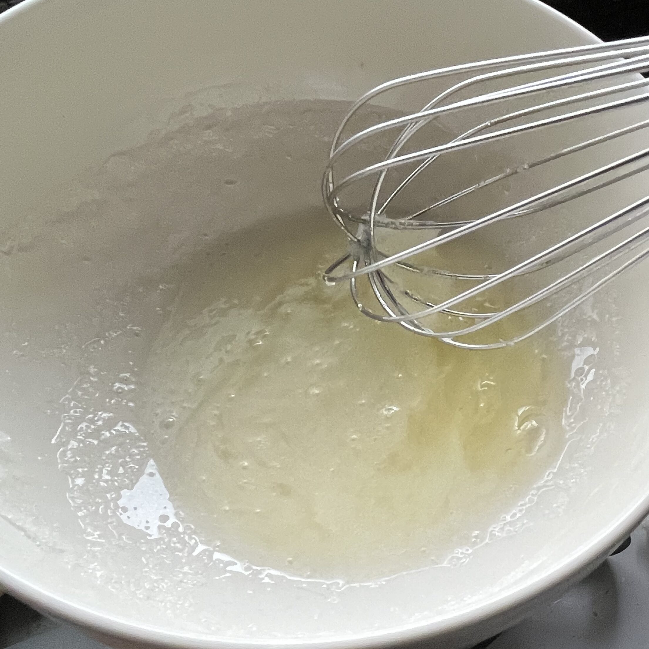 途中でボウルの底が冷たくなってきたら湯煎にして温めると良いです。マシュマロくらいの固さまで泡立ててください。
