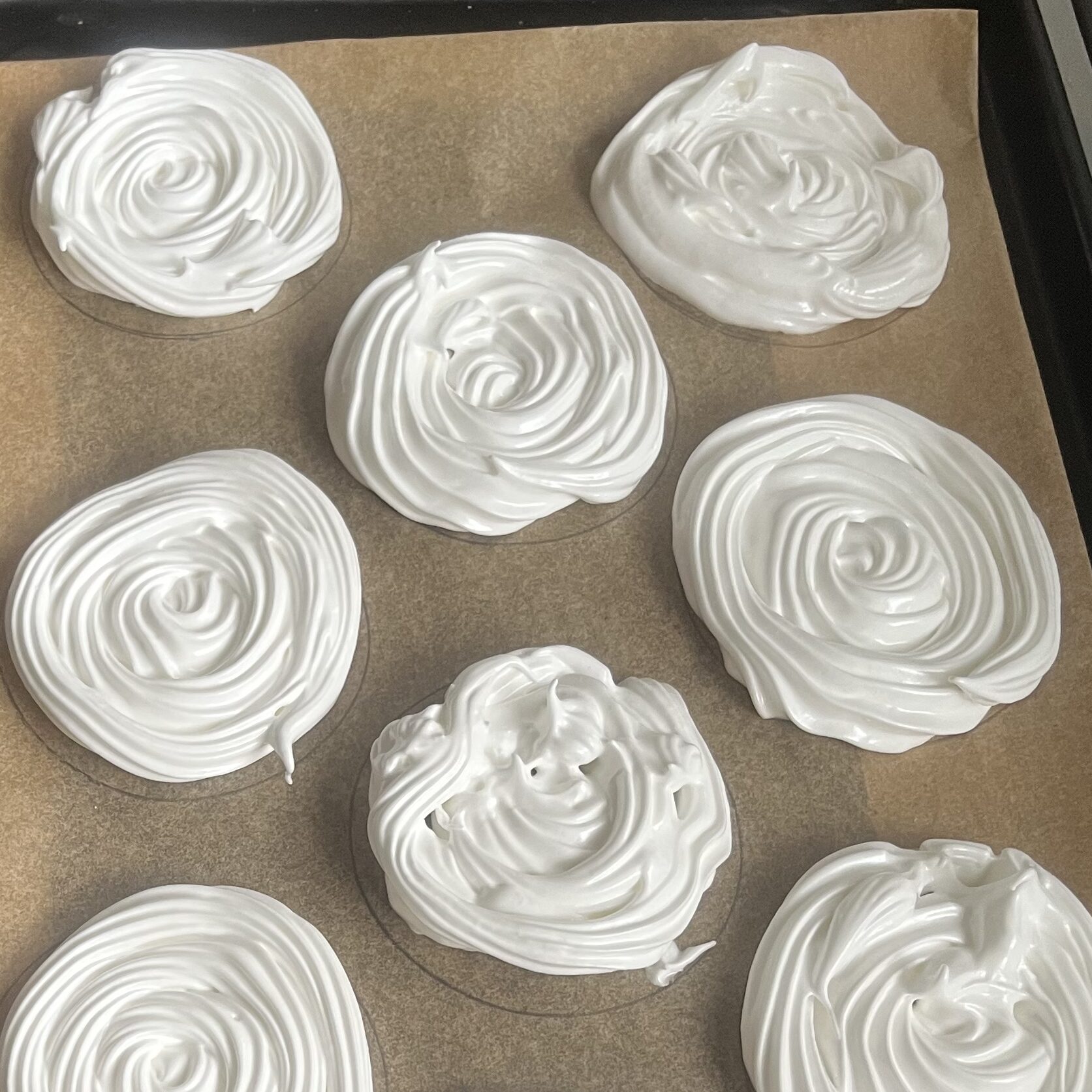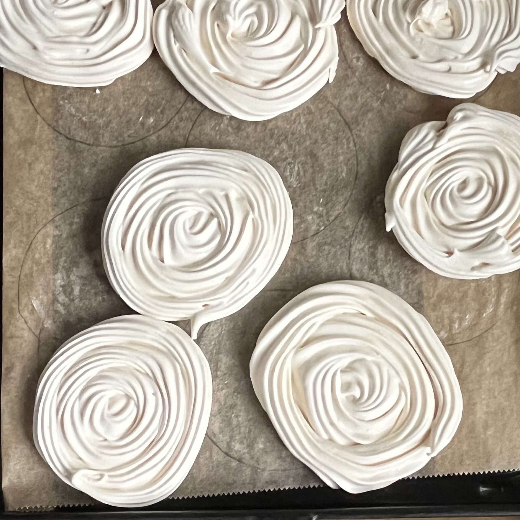 - できたメレンゲを絞り出し袋に詰め、天板に絞り出す。