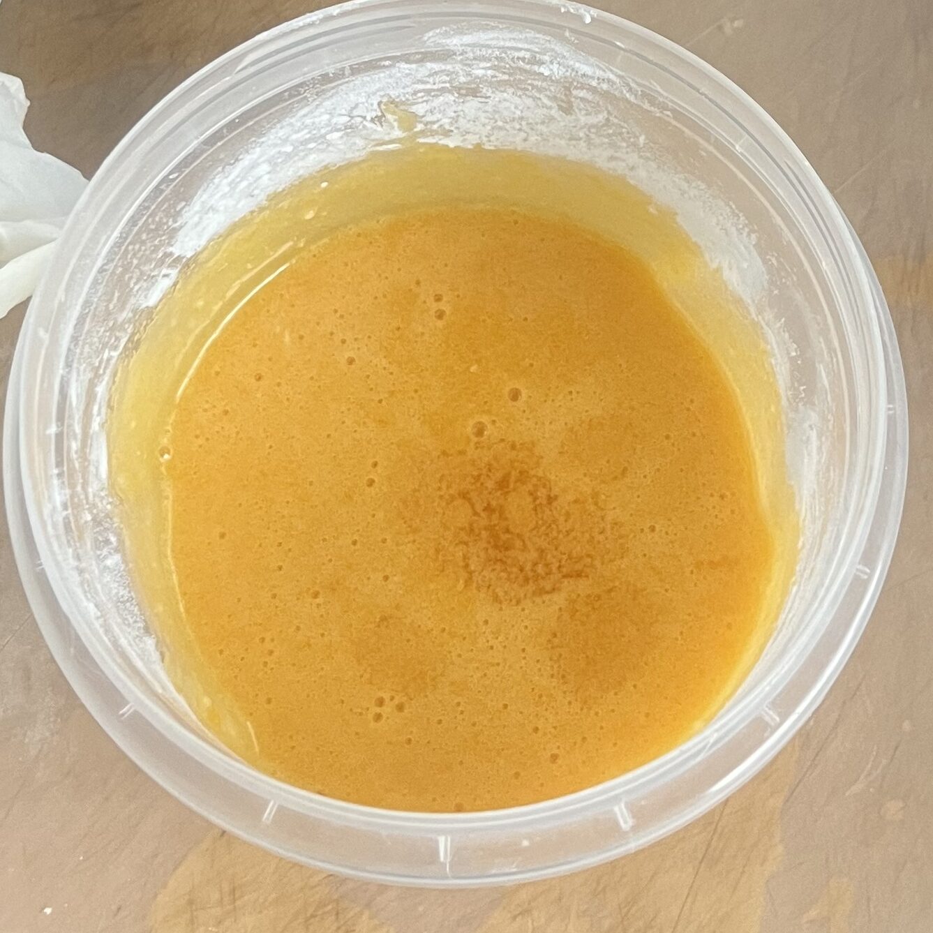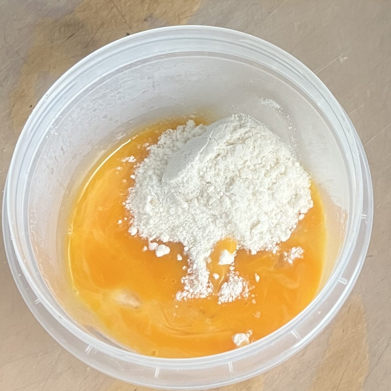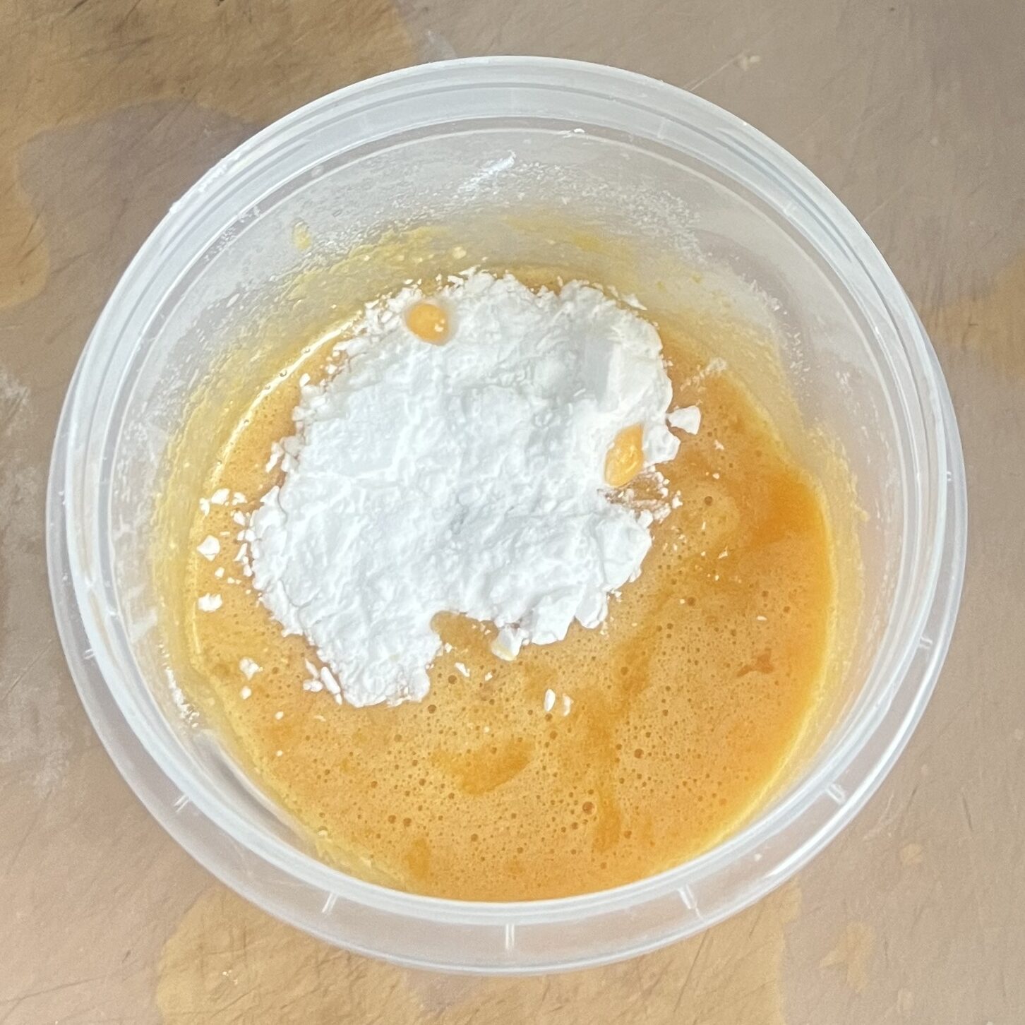卵黄を入れた器に、砂糖、コーンスターチまたは片栗粉、お好みでバニラエッセンスを入れその都度よく混ぜる。