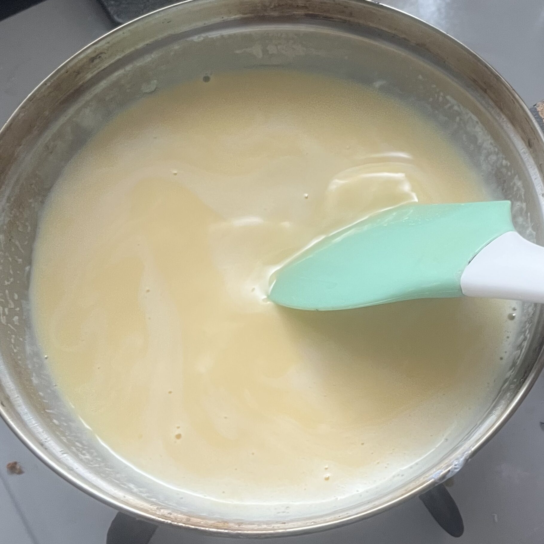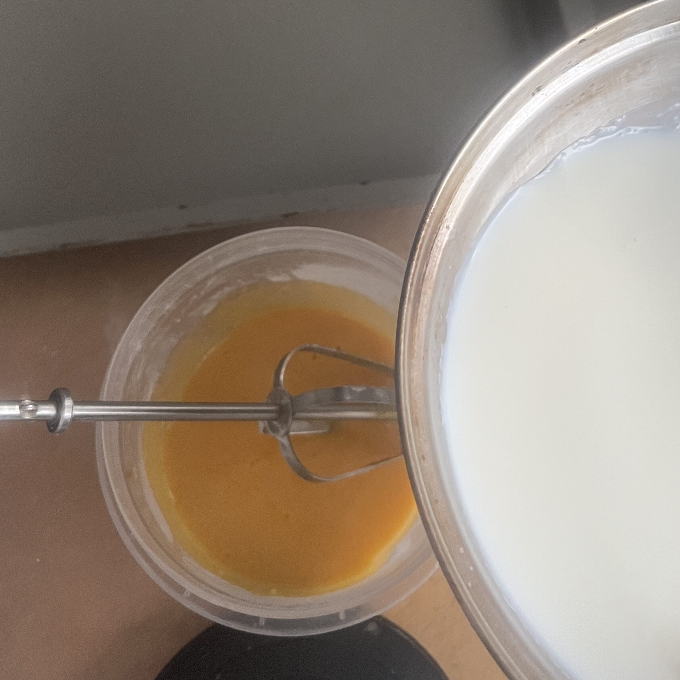 - 小鍋で牛乳を温め、混ぜた卵黄の器に少しずつ注ぐ。