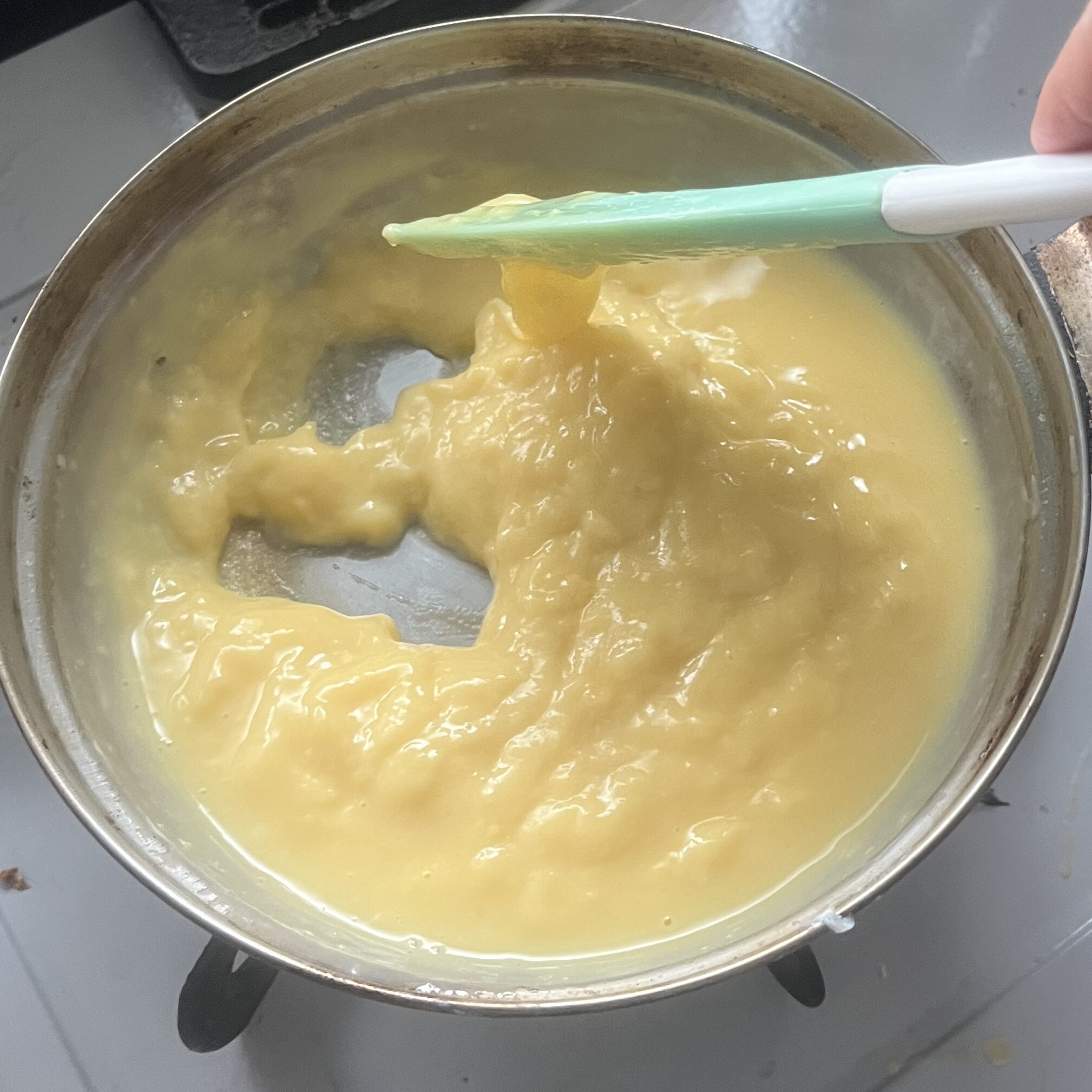 - 8を小鍋に戻し、ごく弱火でとろみがつき鍋肌が見えるまで加熱する。