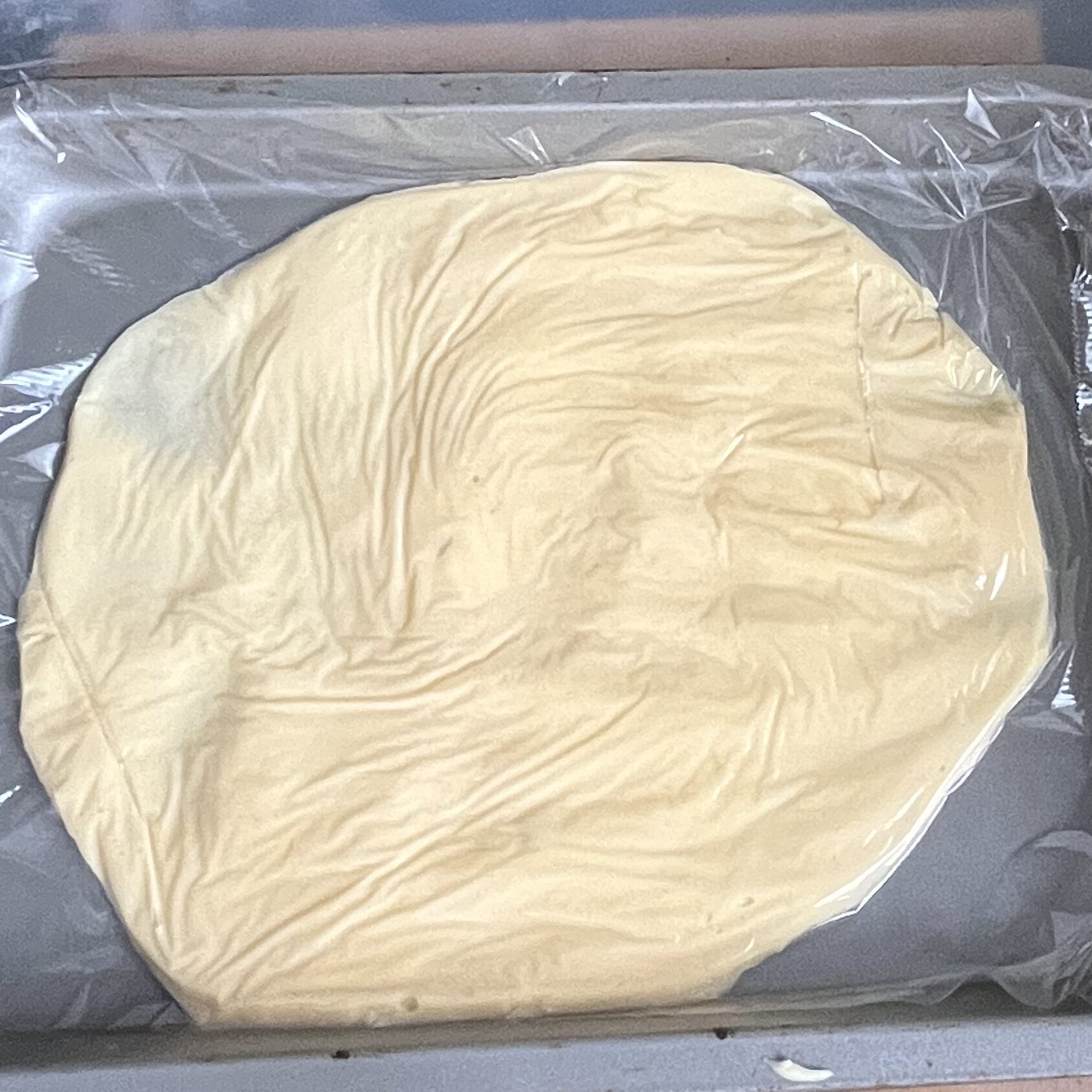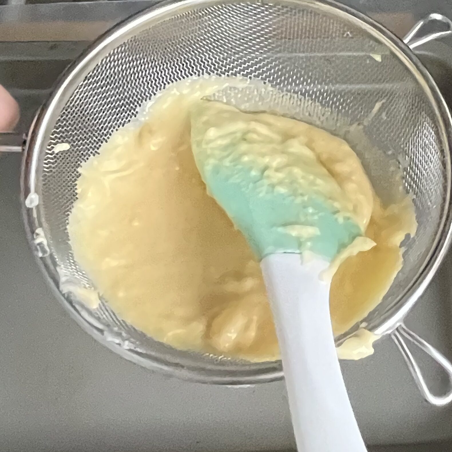 - なるべく大きな平らな容器の上でクリームを裏ごしし、ラップをかけ大きく広げて冷ます。