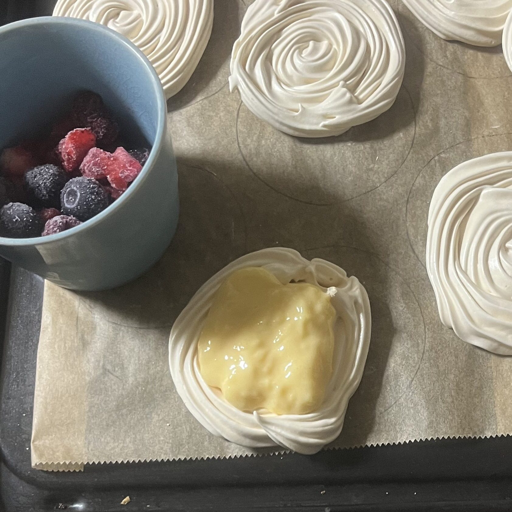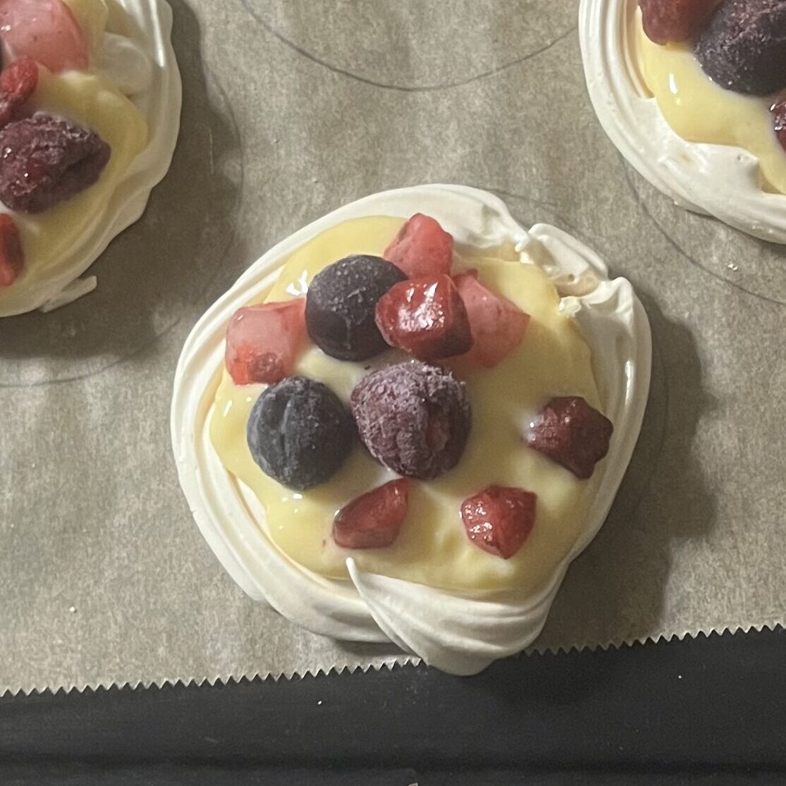 - メレンゲにクリームを重ね、冷凍ミックスベリーをトッピングする。