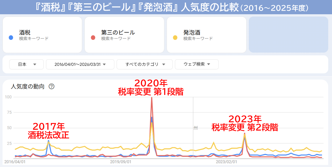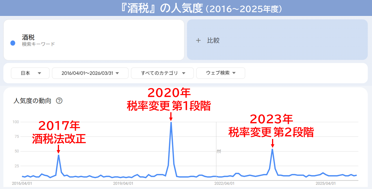 酒税法改正は2017年から始まり、ビール系飲料の税率は2020年、2023年と段階的に変更。そのたびに青線の『酒税』の検索も急増してきました。
