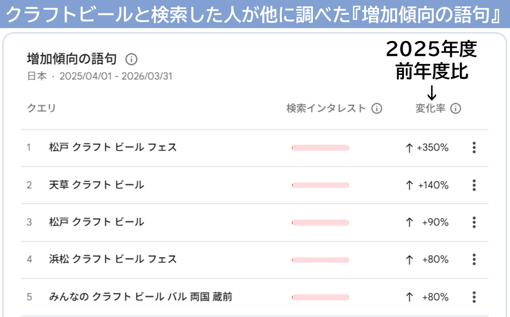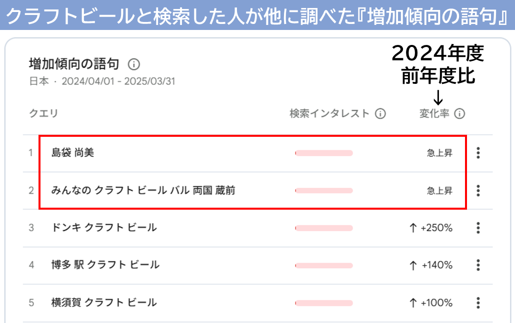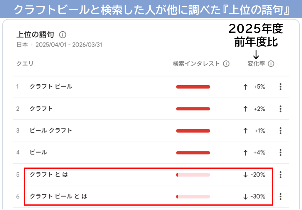 2024年度、赤枠で囲んだ『クラフトビールとは』『クラフトとは』の検索は、それぞれ50%減少しています。そして…