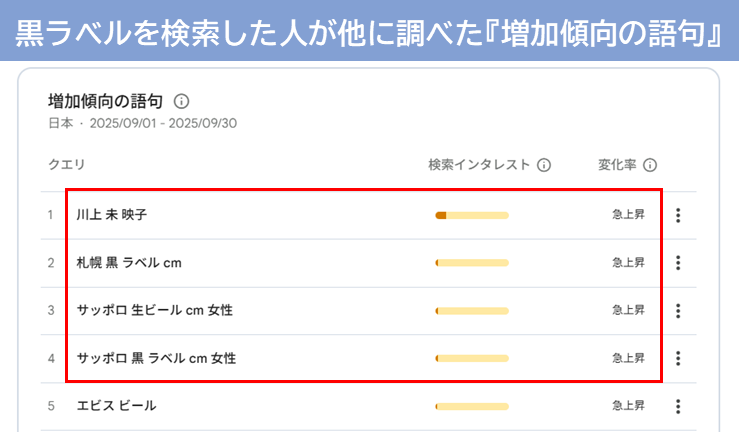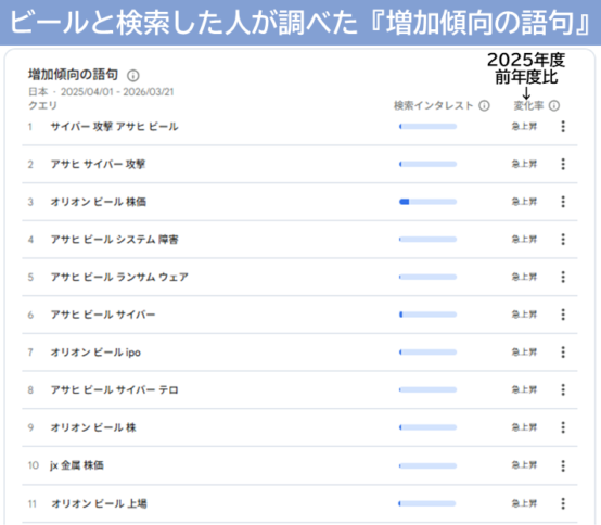答えはこちら。2025年度にビールと検索した人が『他に調べた語句』のうち、5,000%以上の急上昇をした言葉の一覧です。
