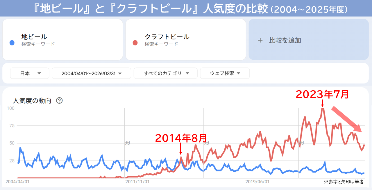 赤い線が『クラフトビール』です。2009年ごろから検索されはじめ、2014年8月に『地ビール』を追い抜きます。その後、季節によるアップダウンを繰り返しながら2023年7月に最高値に到達。しかし、それ以降は急落しています。なぜなのでしょうか?