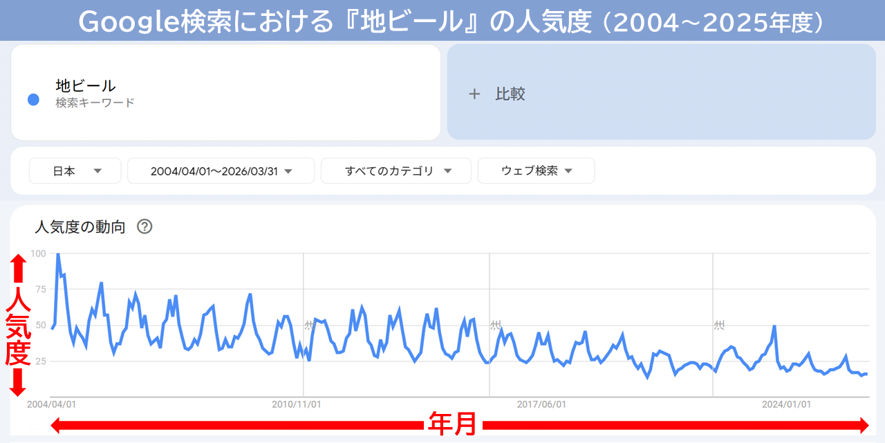 縦軸が検索量をもとにした人気度。横軸はデータがある2004年以降の年月です。青い線の『地ビール』は毎年、春から夏に上がり、冬に下がっています。これは冷たい飲料によくある傾向。そして20年あまりで、右肩下がりになっているのが分かります。