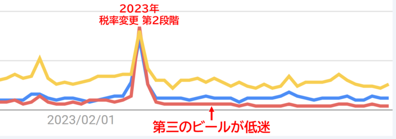 2023年の税率変更の後、赤い線の『第三のビール』が以前より低く推移するように。これは、安い税額のメリットを失ったためでしょう。