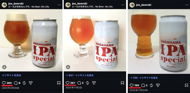 こちらは、筆者が大好きな長濱浪漫ビールのIPAをInstagramに投稿した画像。同じビールでも、赤い線を引いた「いいね」の数を左から見ていくと、年々減っているのが分かります。