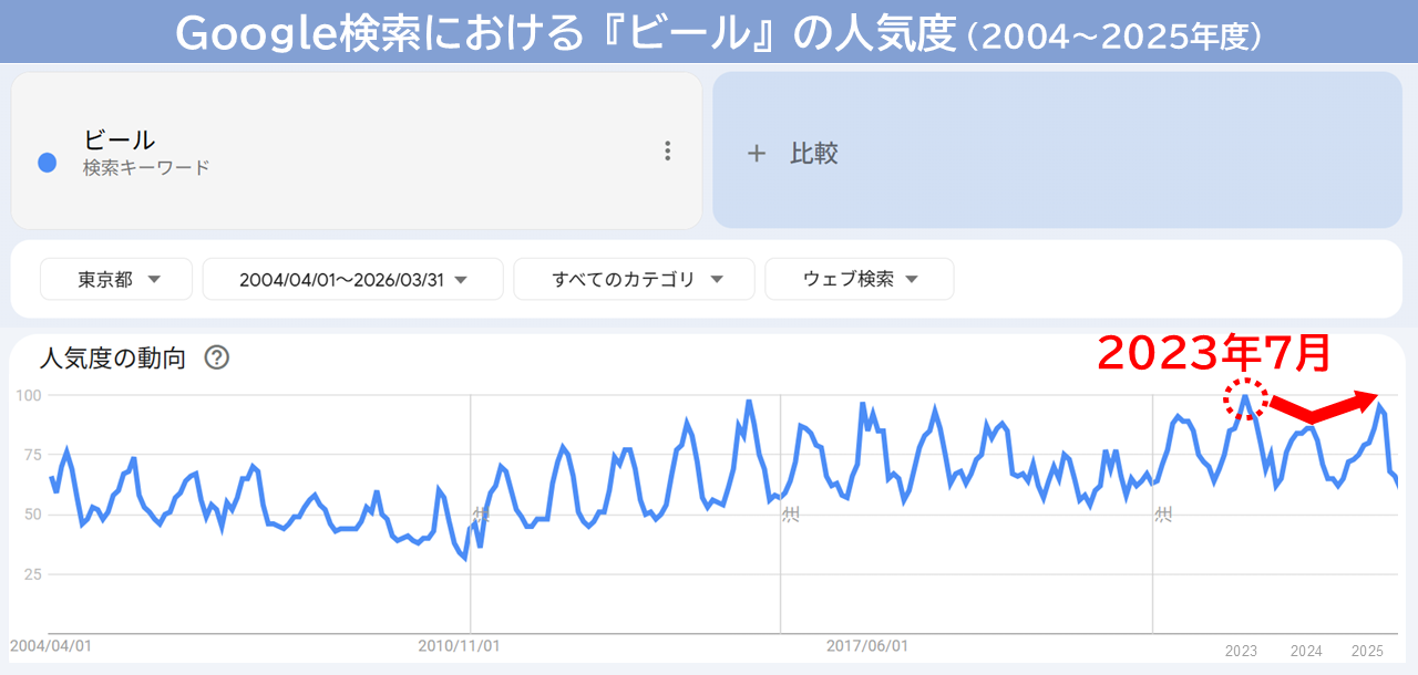 『ビール』も季節によるアップダウンを繰り返し、2023年7月にピークに到達。その翌年は下落したものの、クラフトビールと違うのは2025年に回復したこと。