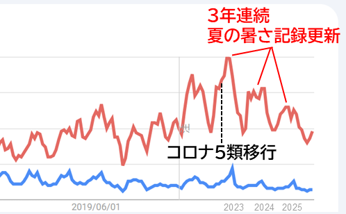 考えられる要因は3つあります。1つ目は「暑さ」。2023〜2025年にかけて毎年、夏の平均気温が過去最高を更新しました。2023年は暑くても、新型コロナによる外出制限から解き放たれたこともあり、店舗やイベントで飲むための検索が増えています。