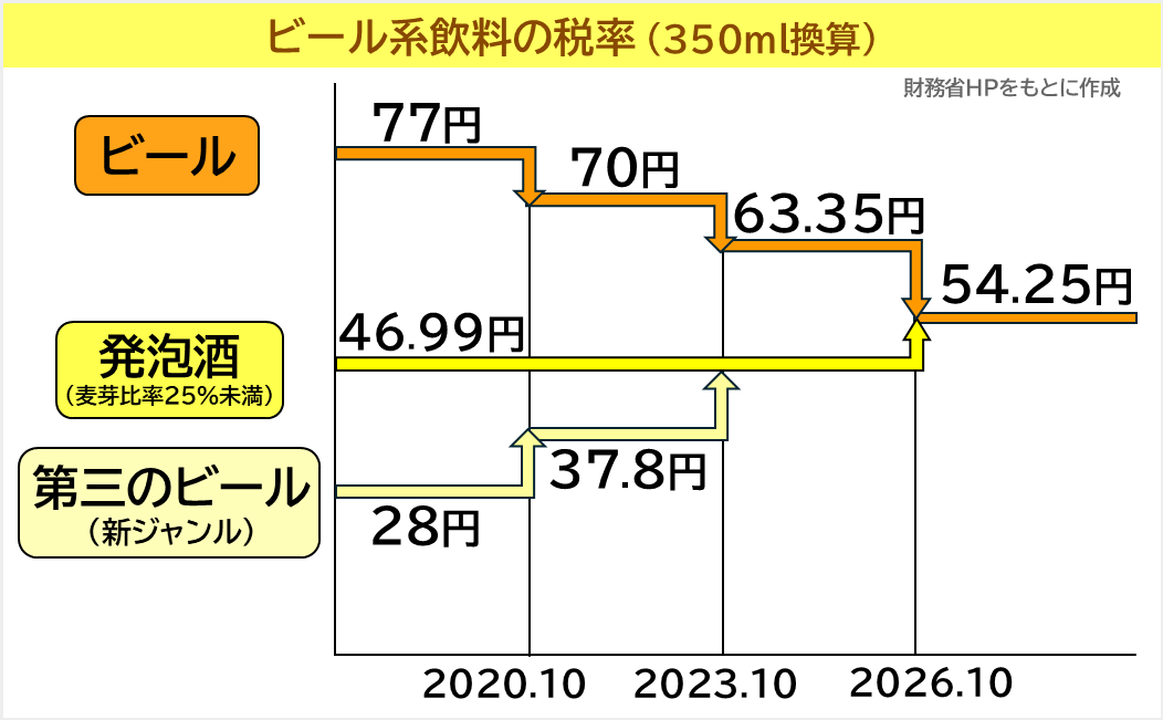 しかし「第三のビール(新ジャンル)」の税率は2020年と2023年に上がり、発泡酒と同じになりました。