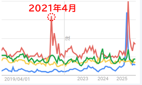 なお、赤い線のアサヒビールは2021年4月にも人気度が急増しています。何があったか覚えてますか?