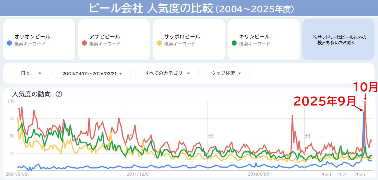 赤い線のアサヒビールは、過去20年あまりにわたって上位をキープ。時折、緑のキリンビールに抜かれても首位に返り咲いてきました。そしてグラフの右端、2025年の9〜10月にアサヒビールと青線のオリオンビールは過去最高値を記録。