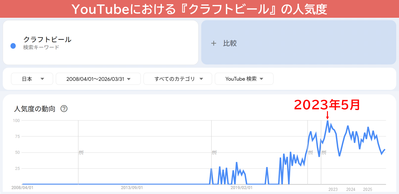 こちらはYouTubeで『クラフトビール』の動画が検索された人気度です。2017年ごろから増え始め、2023年5月にピークに到達。その後アップダウンを繰り返しながらも、大きくは下げていません。