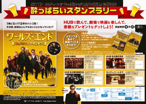 渋谷シネクイントの初日は、なんと全回立ち見続出という大ヒットで幕明けました。公開を記念して、渋谷のビアパブ12軒で開催中のパブクローリング(=ハシゴ)イベントも、連日たくさんのビアラバーの皆様が〝ワールズ・エンド〟目指してクローリング挑戦中です。
