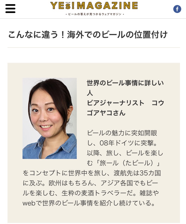 さて、ビアジャーナリストとして大活躍中のコウゴアヤコさんが、このたびサッポロビールのウェブサイト「YEs!MAGAZINE」で、世界のビール事情に詳しい人として紹介されました。